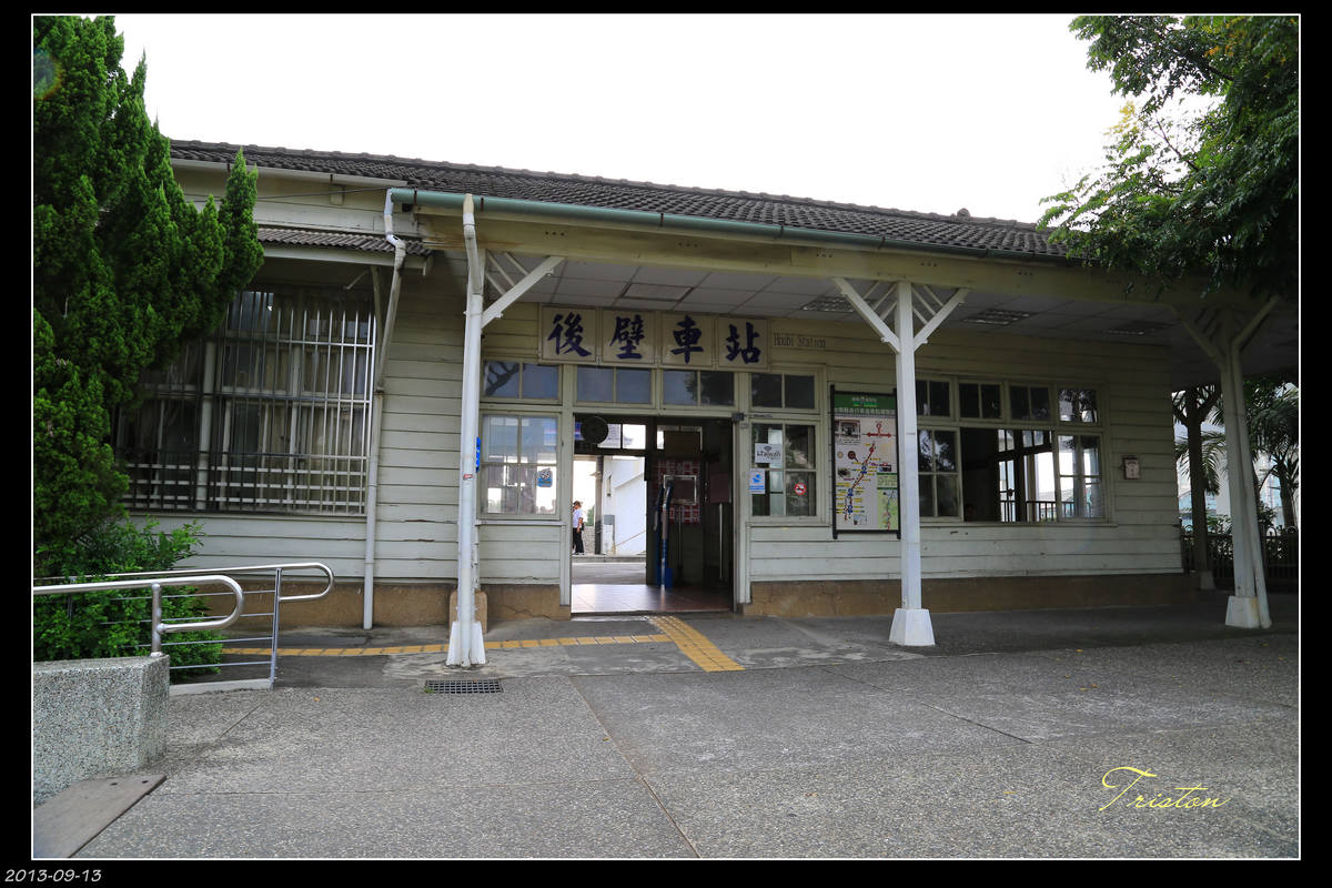 後壁車站,木造車站,屋頂為水泥瓦,用立於洗石子基座上的Y形木柱來支撐的迴廊。牆壁底部是土黃色洗石子牆基,上方則是白色雨淋板。一望即知,有點歷史的。七十年。1943年建成。
