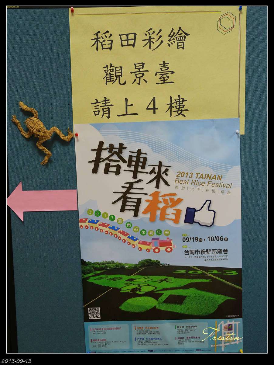 自9月19日起至10月6日推出「台南好米嘉年華會」,以後壁區農會為主要活動場地,開放農會四樓給民眾欣賞壯麗的稻田彩繪2013 台南好米....