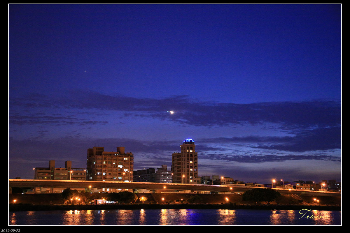 有飛機從金星的方向降落.....淡水河過了台北橋,就是高速公路大橋了。沿著高速公路,松山機場就到囉!