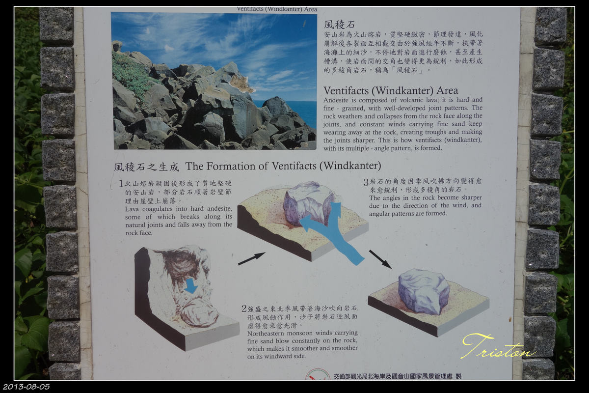 風稜石的生成:原來這裡原本是竹子山緻密均質的兩輝安山岩所構成的熔岩臺地末端,堅硬均質的安山岩塊受風沙的長年磨刮,成為佈滿擦痕的岩面和尖銳稜線,也就是所謂的風稜石。