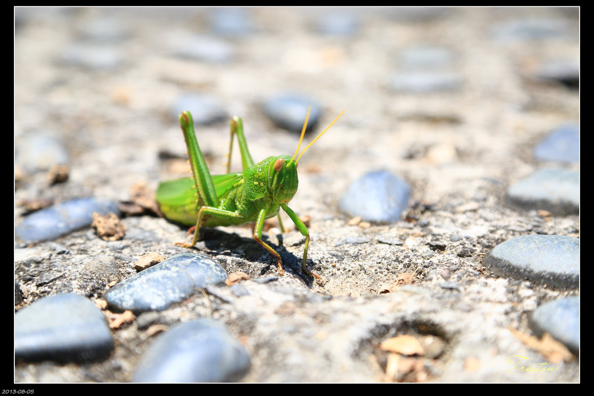 台灣大蝗雄踞路上,一點沒讓路的意思,簡直是蝗臂擋車!擋不住的啦!