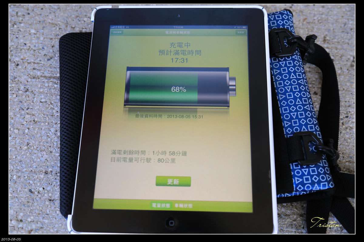 取車同時還會車附上一台 iPad, 除了能免費 3G 上網 以外, 還有專屬的電動車 App, 裡頭有車輛的電力情況, 推薦行程, 充電站位置...等, 真是貼心咧...不過租車..我們還是很小心的...畢竟這裡我們也不太熟..