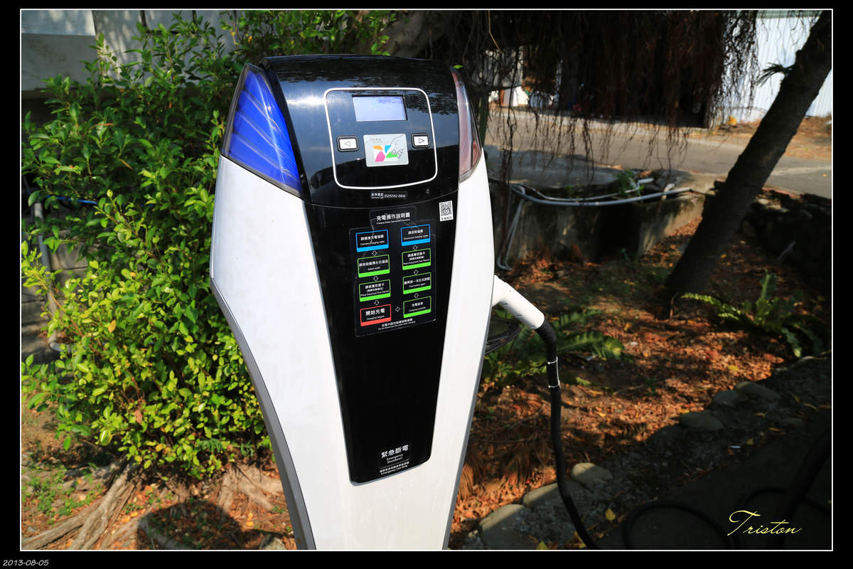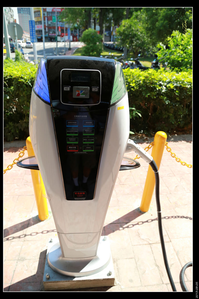 OK!!!下午二點多,又要回到電動車的身上,我們一路由淡水到金山,其實不到幾十公里,但是為了體驗電動車的充電,所以特地到了金山活動中心來玩玩,這裡有台電動車充電站,充電的程序很簡單,按照格子上的順序插好隨車的充電線,刷了悠遊卡,就開始充了。