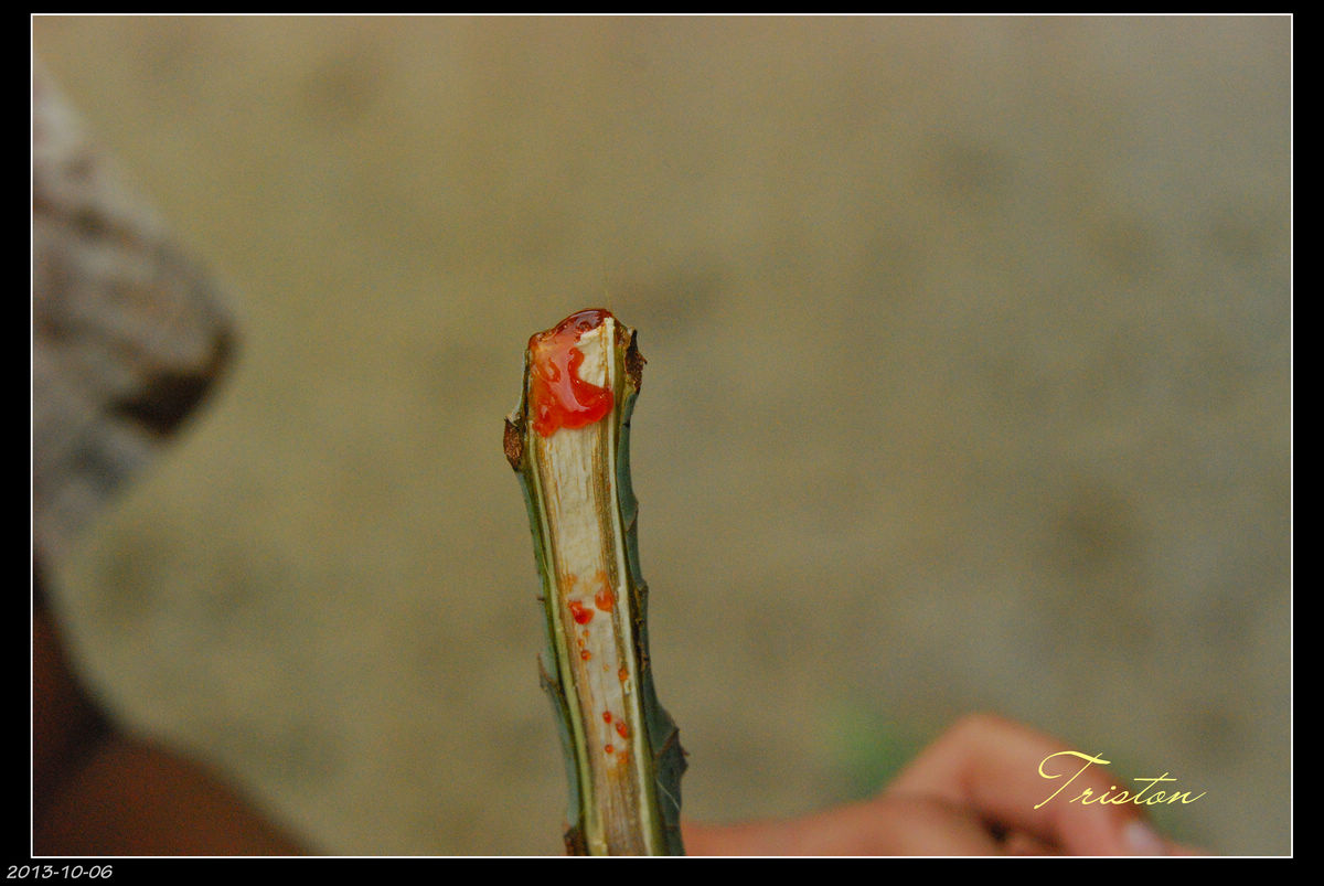剛剛折下的血桐的汁液中含有鐵離子,時間一久真的氧化後變成的"血"...