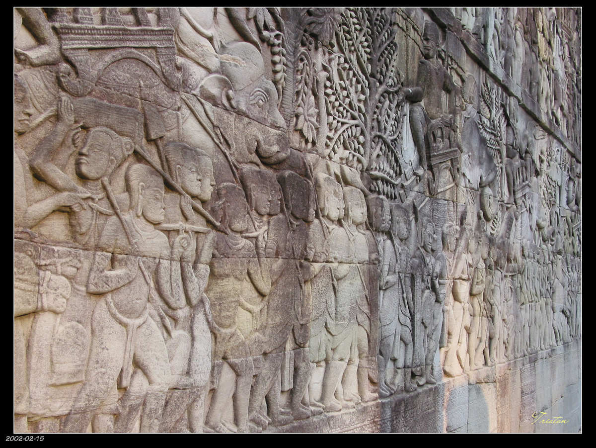 百茵廟Bayon:賈雅西曼七世建造此座古剎採用粉紅色的石頭。此廟中的壁畫雕工在所有吳哥古蹟中最為精緻細美。
