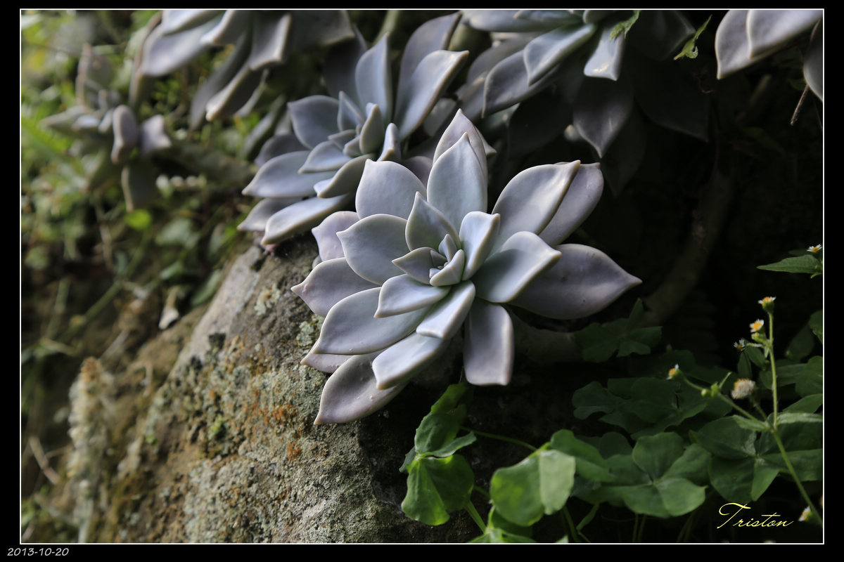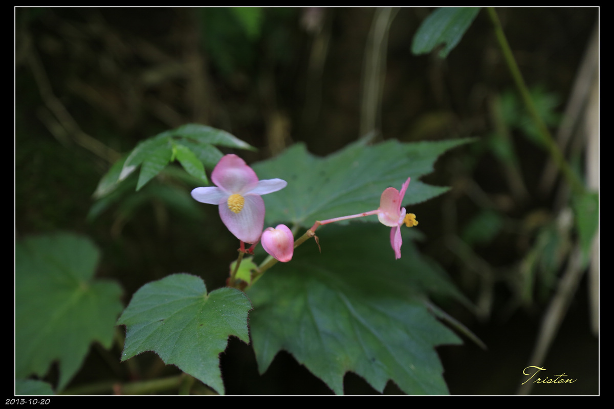 擋土的石壁上長了一片水鴨腳秋海棠,粉粉嫩嫩開了幾株小花...