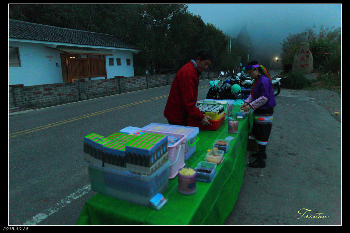 五點半,突然來了輛廂型車,一對夫妻開始擺攤,狐疑著,向前搭訕,才知這裡也是阿里山遊客的觀日出景點之一,他們可是做足了準備,就做這一小時生意!好拚...