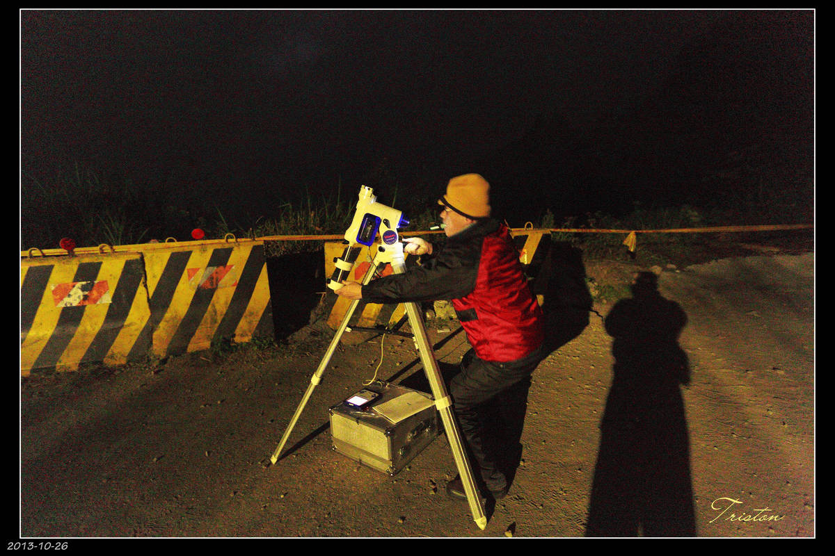 歷了三個半小時路程,終於找到好地點。架好望遠鏡,但無奈啊,計劃趕不上變化,天空白雲時聚時散,霧氣彌漫,天上星星若隱若現,赤道儀好像也出了點問題。當下決定回到東埔山莊睡覺,明早有機會再戰艾桑ISON彗星。