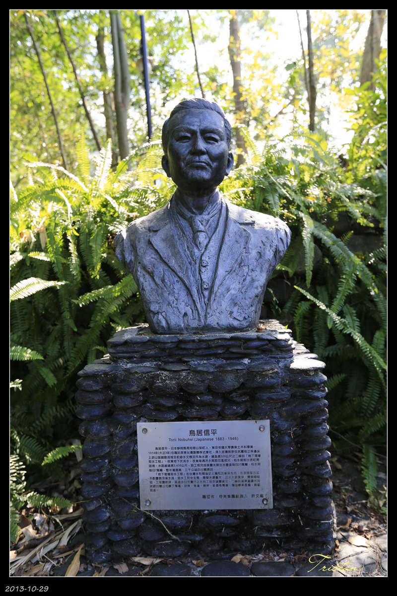 森林公園入口右側是奇美實業創辦人許文龍先生塑的鳥居信平。鳥居信平1908年畢業於日本東京帝國大學農學院,進入日本農商務省服務,當時的台灣製糖業剛開始工業化發展,由三井財閥創立的台灣製糖株式會社在阿緱廳歸來庄(今屏東縣屏東市)建阿緱工場,該廠在1909年11月到1910年11月之間進行擴張,將壓榨能力從1200噸提升到3000噸,為當時東洋最大的糖廠。但1914年時,因為台灣連年遭遇颱風,蔗田受損嚴重,鳥居信平經其師上野英三郎介紹,臺灣製糖聘請他來台,規劃水利工程。他在屏東等地興建了多處灌溉工程,當時為了汲水灌溉萬隆農場的甘蔗田,鳥居信平以林邊溪及力力溪做為水源,分別建造二座2300多公尺長的地下堰堤灌溉大圳,並以當年株式會社社長山本悌二郎的雅號「山本二峰」命名為「二峰圳」。
