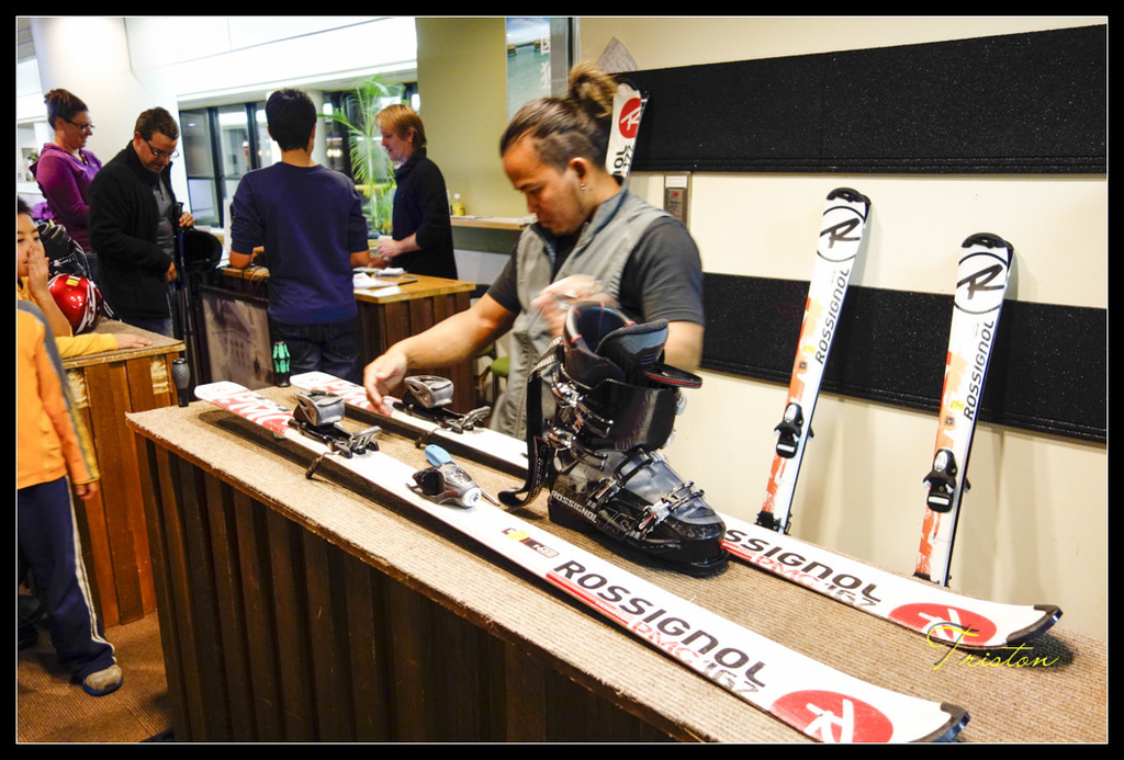 再來就趕快來借雪具囉....一邊排隊,耳朵一直聽到問鞋多大啊,多重啊,然後就有工作人員按照體重調整ski...看到別人拿著好長的ski...那麼長...會不會摔死啊..人家車神舒馬克都掌握不住了..我好緊張哦..雪具的租借包括ski和雪杖pole..還有滑雪用鞋子..費用一天要5000多日幣.....一個人...我們先預約三天...因為帳台的老外說..反正要先還就再退費囉....看來他還蠻熟悉菜鳥的結局...大多人都滑不到三天...