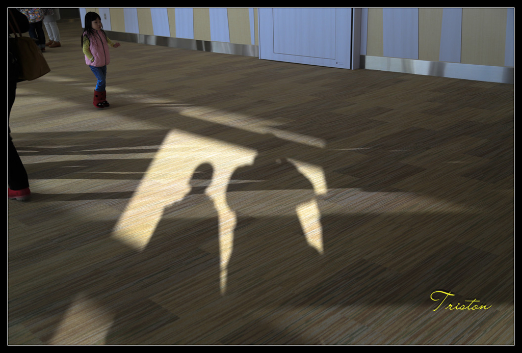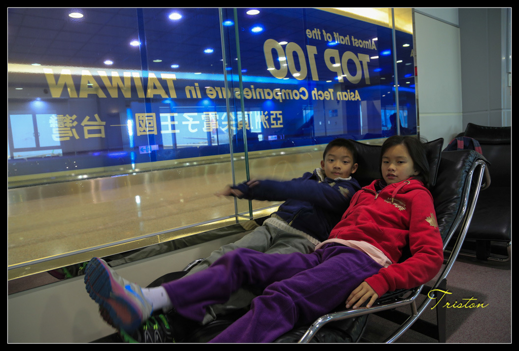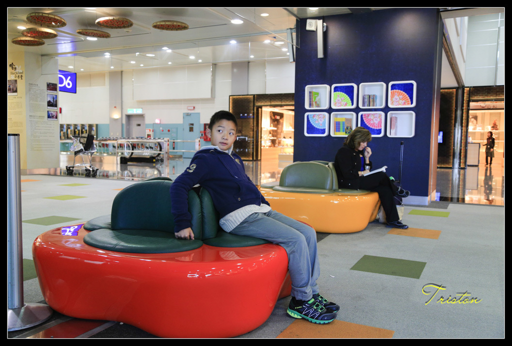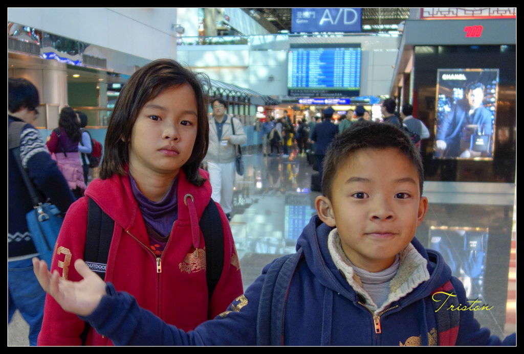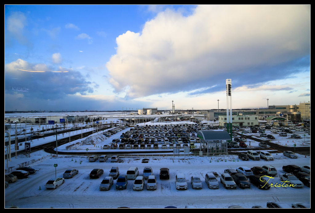 國際線大樓的窗外停車場堆滿了前幾天所下的白雪,藍天白雲,再補上皚皚積雪,都快擋不住小朋友想要衝出去玩雪的心情了.....