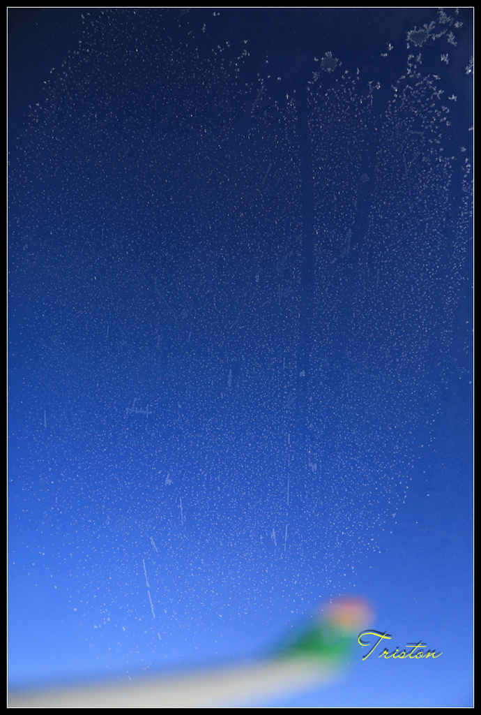 再來的照片就由姐姐在窗旁掌鏡了...隨著航程北上,窗戶外開始出現了結霜的冰晶,外頭的天空好藍,期待這幾天在北海道都是好天氣...我們都有一個奇怪的印象,以為北國除了陰灰灰的天空,要不就是一直飄雪,很難想像在雪地裡的陽光普照的大藍天。