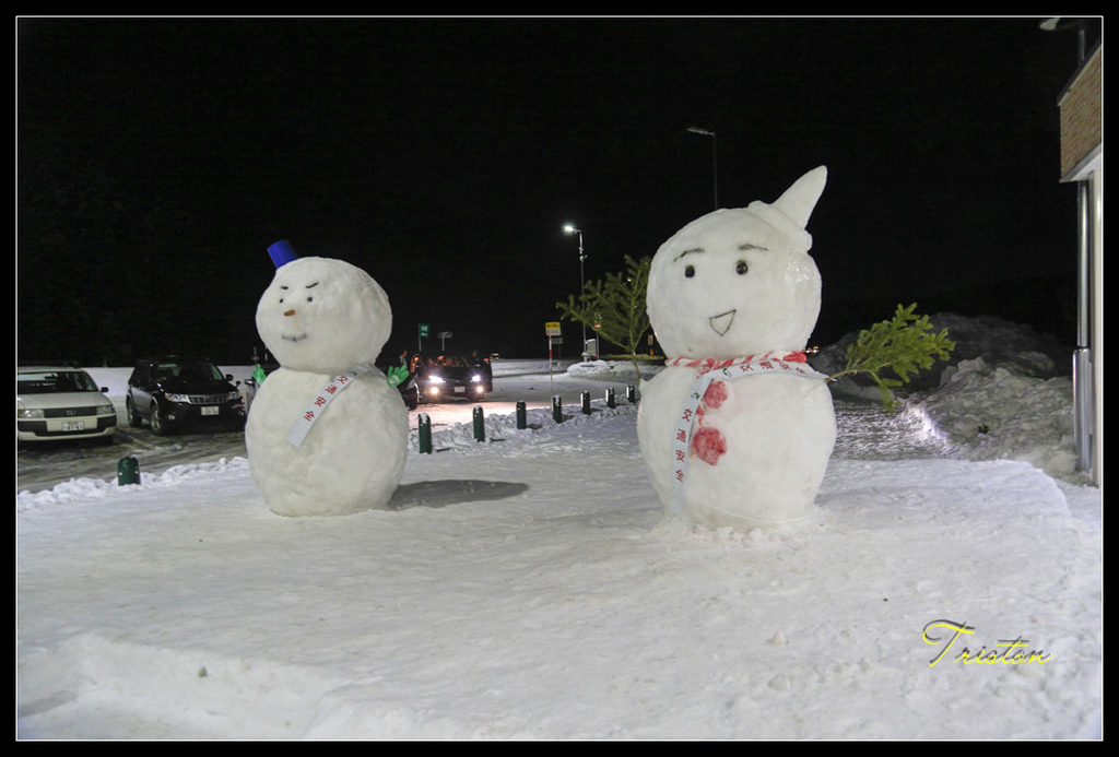 吔!!!在高速公路上的休息站旁堆了兩個交通安全的雪人....