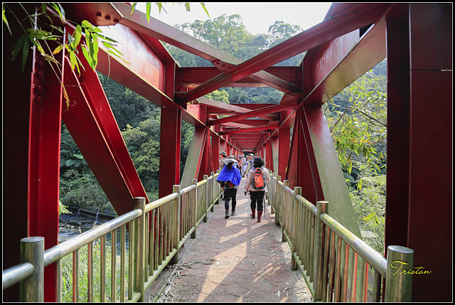 突然一道紅色鐵橋..橋下基隆河有點壺穴的痕跡...不過不太明顯,應該不是著名的大華壺穴吧!