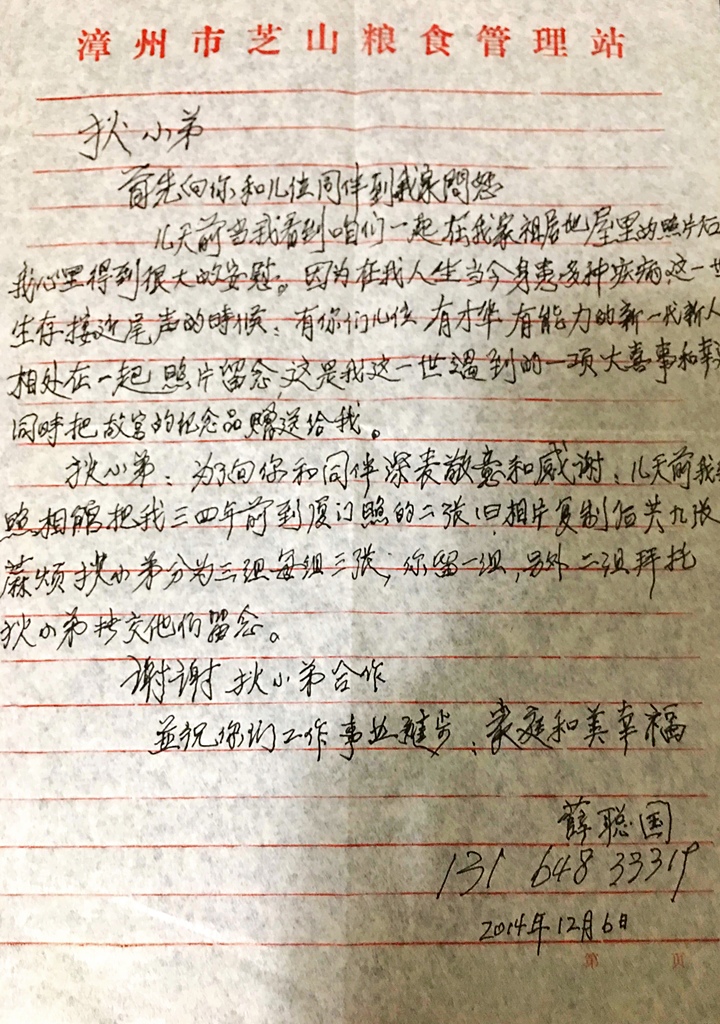 2018年,我得到了一些消息,原來之後薛老伯和我們的狄兄聯絡上了,還寄了相片和寫信來,蘇子說:人生到處知何似,恰似飛鴻踏雪泥;. 泥上偶然留指爪,鴻飛那復計東西!可是,在宇宙無垠的時空交織中,畢竟我們在某個時間、某個空間的座標軸,曾經相遇;也許,這就是佛家說的緣份!