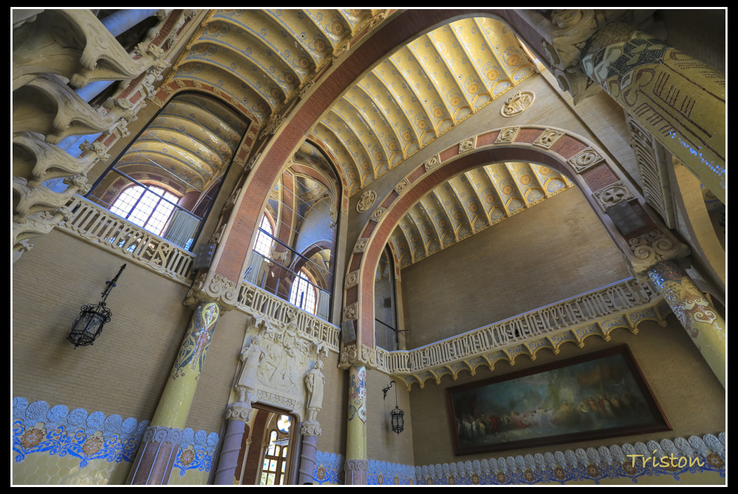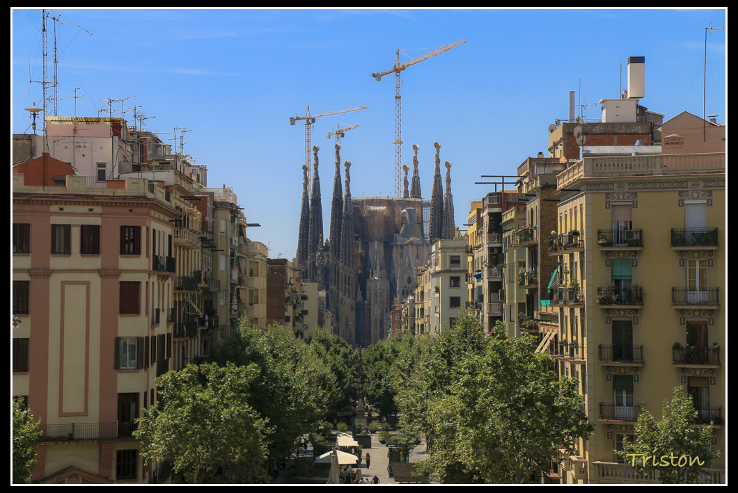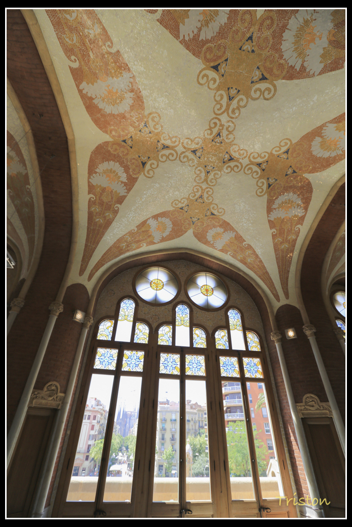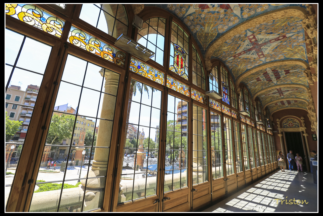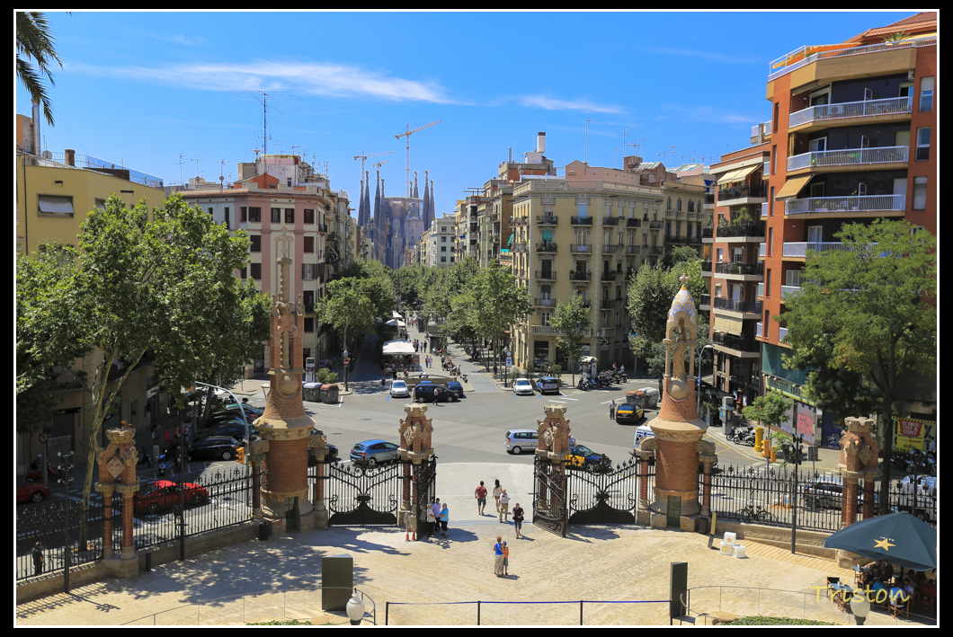 由大廳二樓的窗外沿著高第大道望去,可以看到聖家堂,高第和多明尼克兩位大師,用彼此最滿意的作品,向對方致意