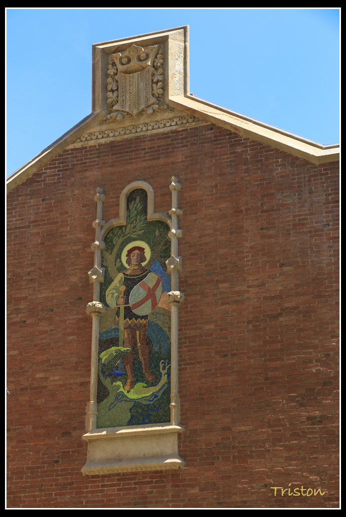 大門的左邊是高懸的十字架,右邊則是持劍的聖保羅