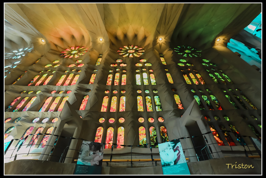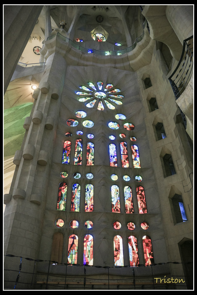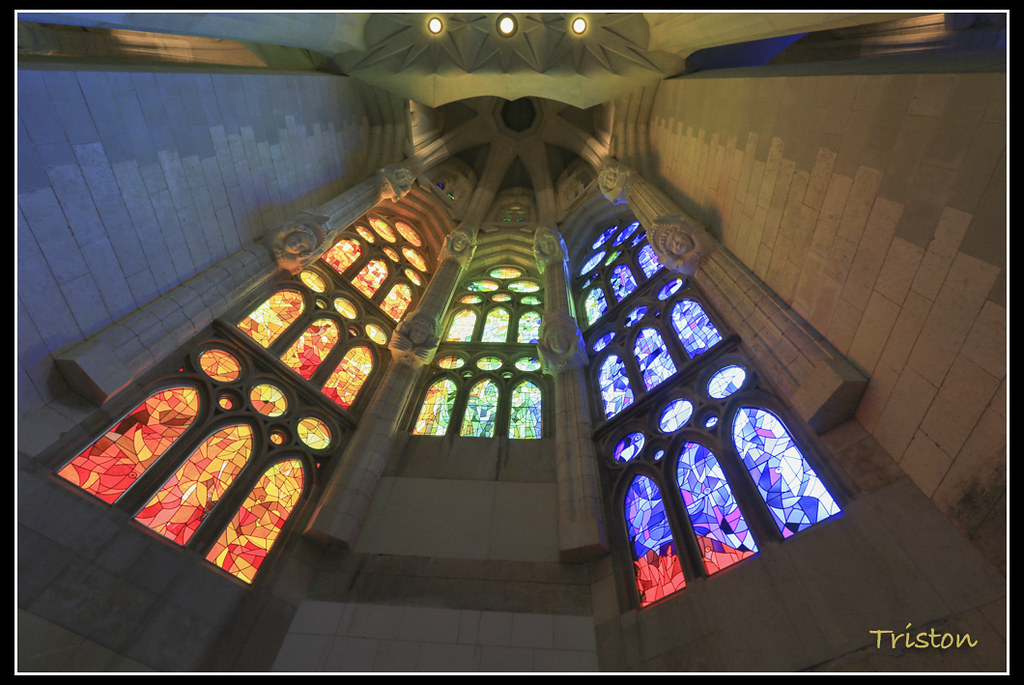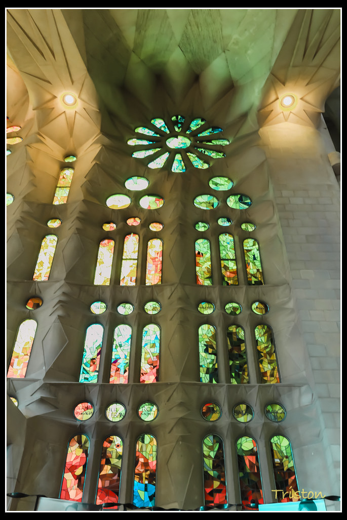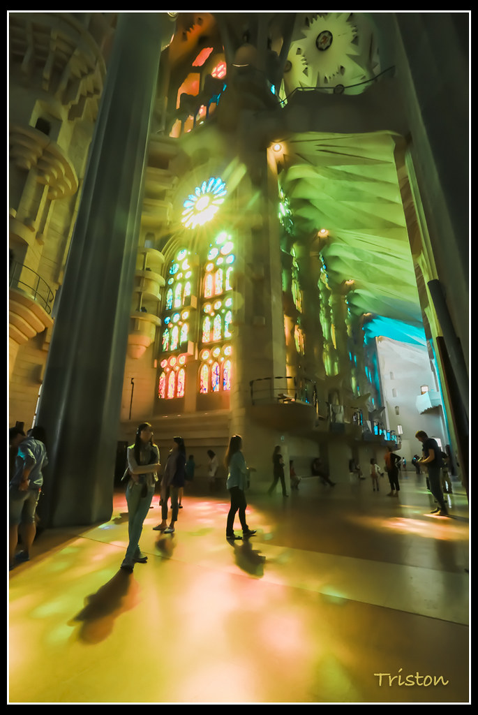 不同於一般的傳統教堂的陰暗,聖家堂的自然光線透過大面積的彩繪玻璃,各色的光束傾洩而下