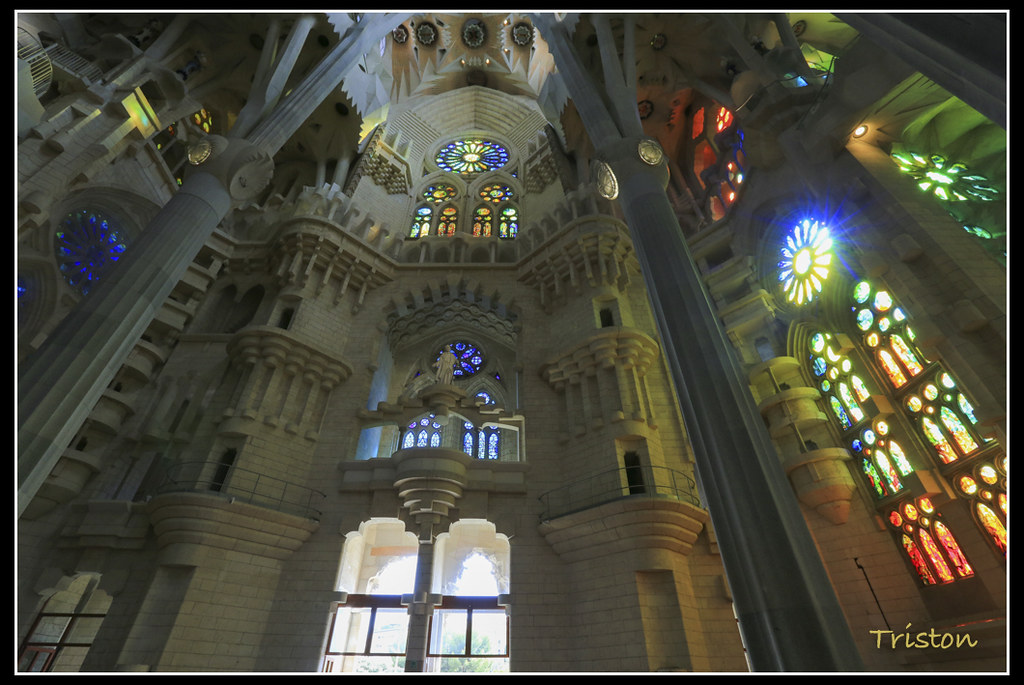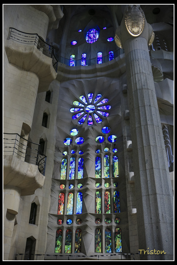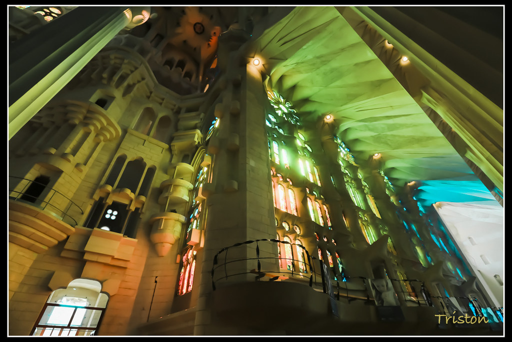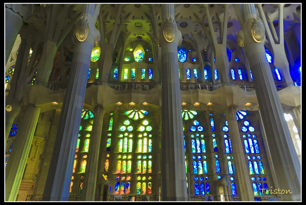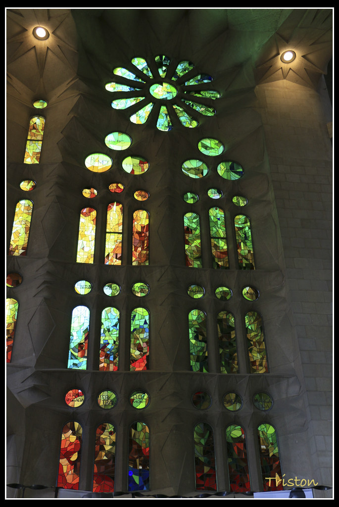 不同於一般的傳統教堂的陰暗,聖家堂的自然光線透過大面積的彩繪玻璃,各色的光束傾洩而下