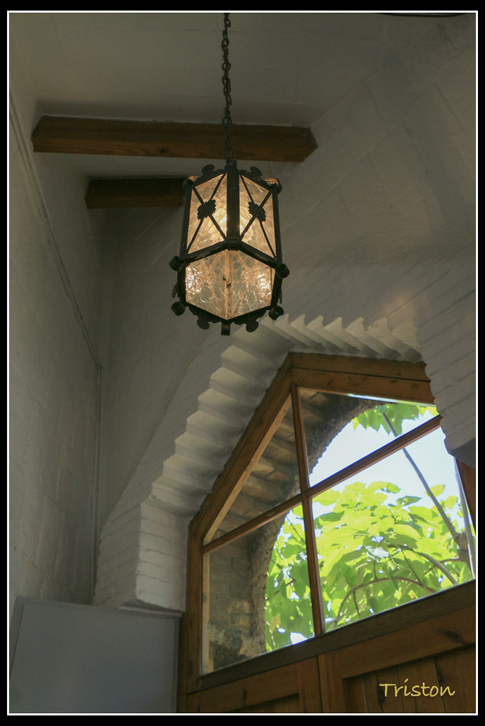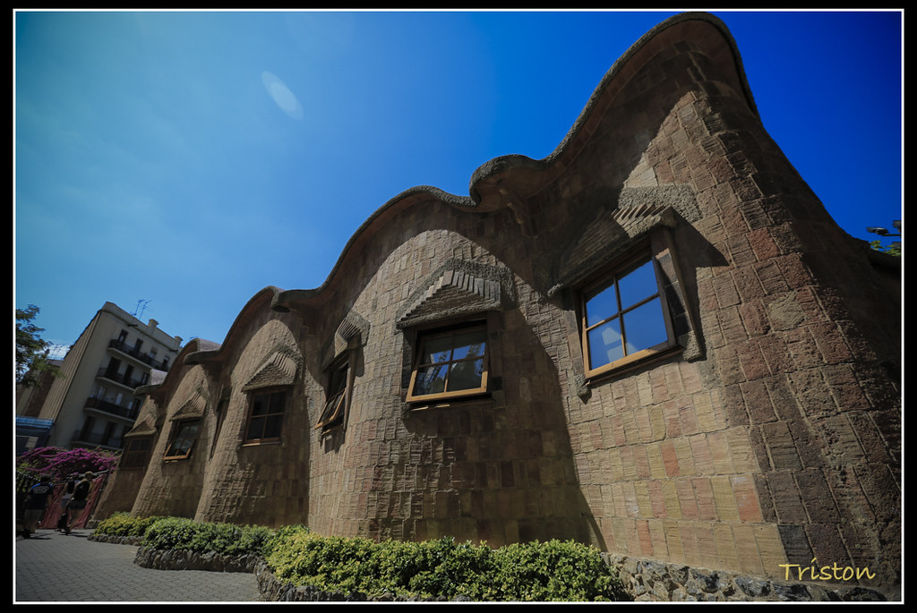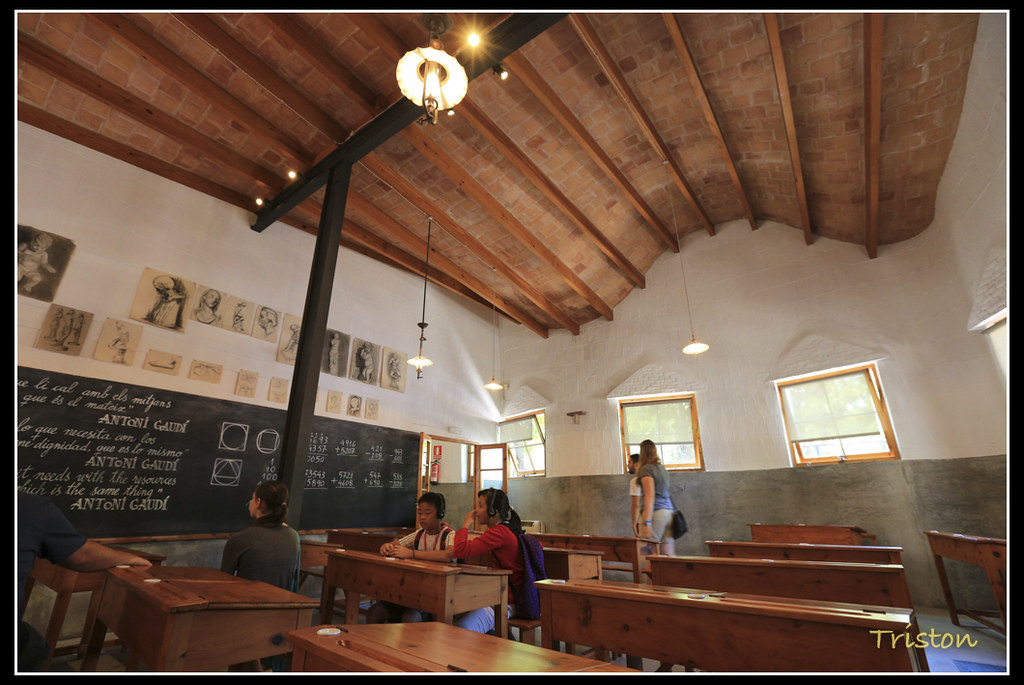 室內不太,天花板的經緯是一根黑色的頂樑,然後用簡單的木柱橫跨,再以加泰隆尼亞磚舖面,形成曲面的屋頂,簡單,實用又成本低廉!這才是大師!