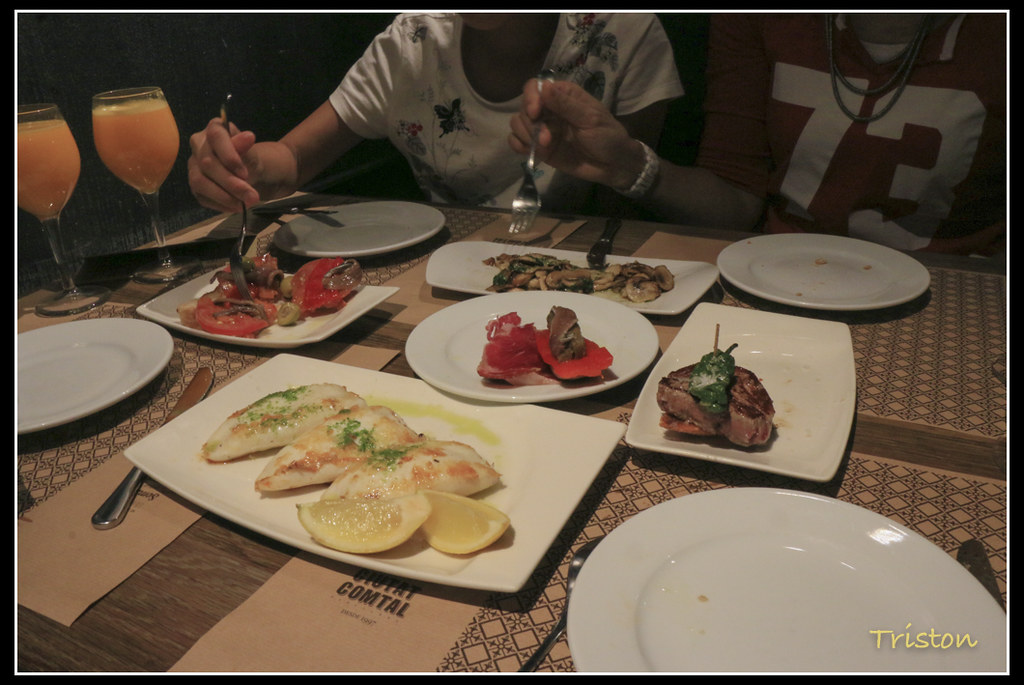 不過我們也不太會點TAPAS,其實應該說我們家庭組合要吃TAPAS有點小麻煩,因為TAPAS幾乎都是下酒菜,口味偏鹹,當一般的飯菜嘛,量又太少,所以我們先前吃過幾次,真的有點不合口味!但是Ciudad Condal的服務生真的很友善,菲律賓籍的,很有趣在比手畫腳和平板的溝通間,完成了點菜。