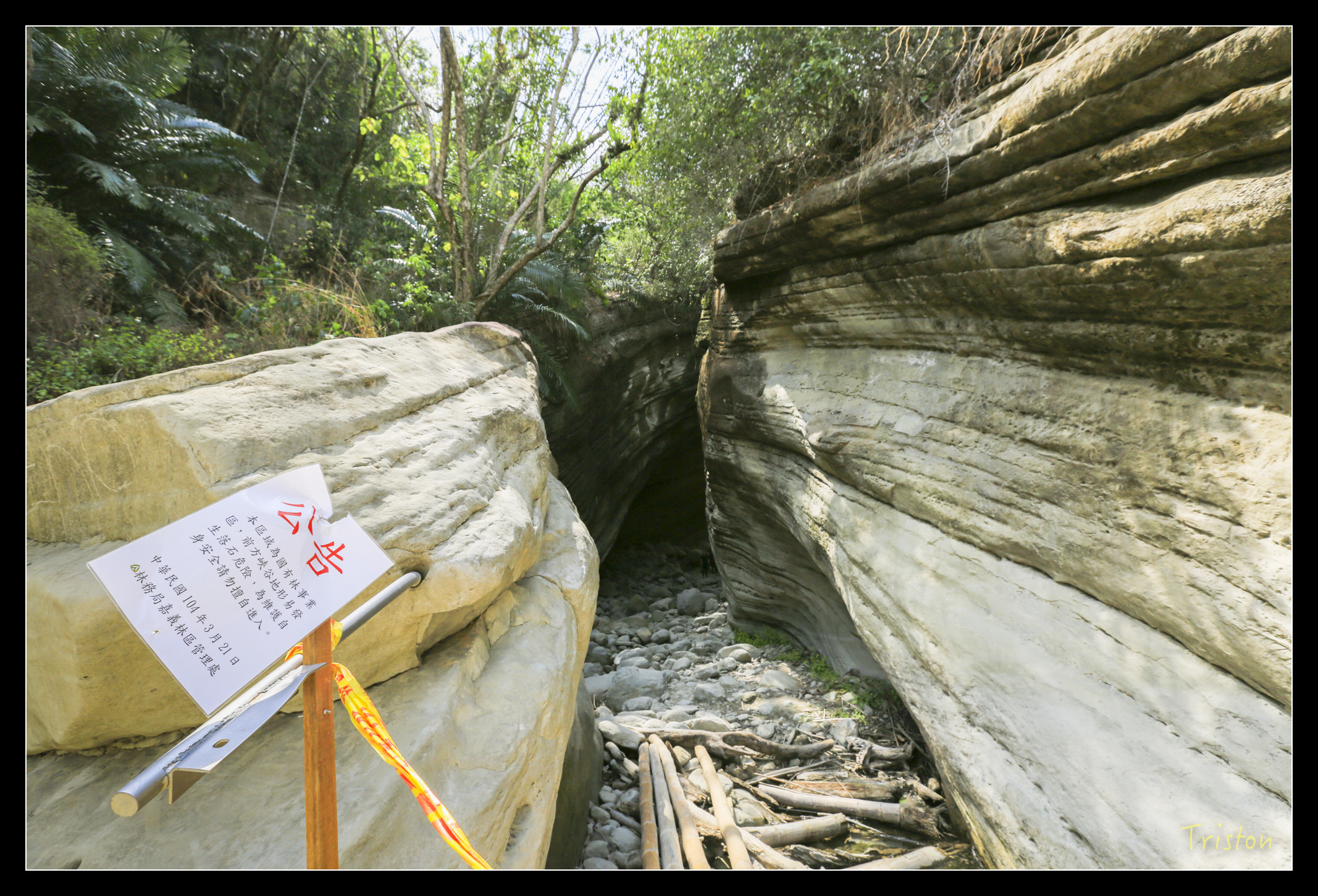谷口不大,僅約一米多寛,但有公告和黃絲帶,沒錯就是這裡!明知山有虎,偏向虎山行啦!