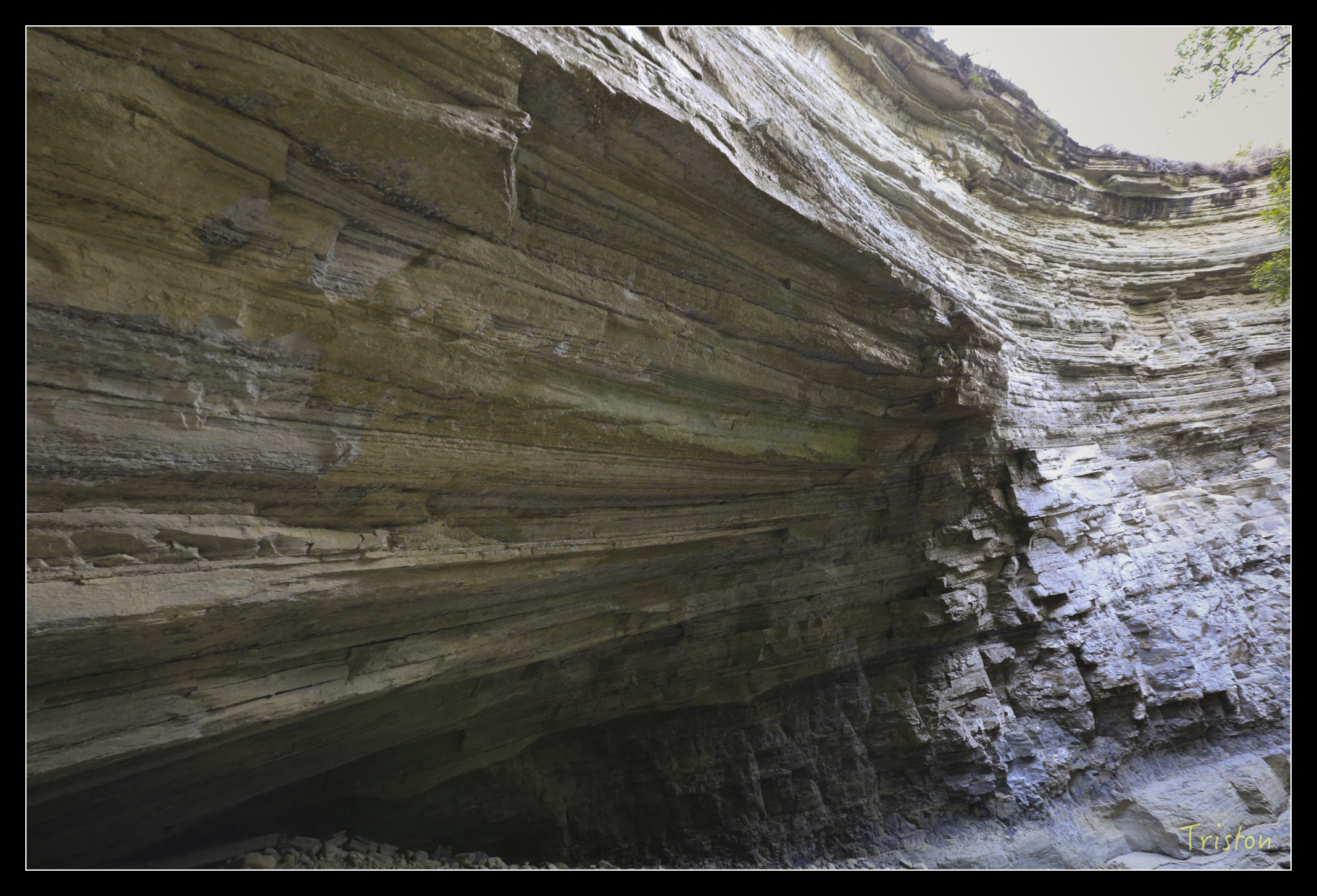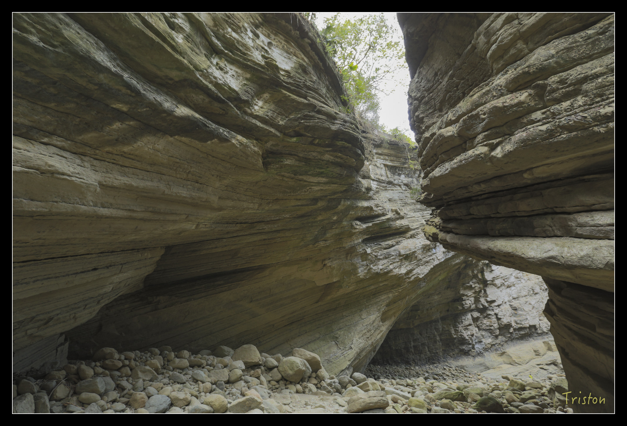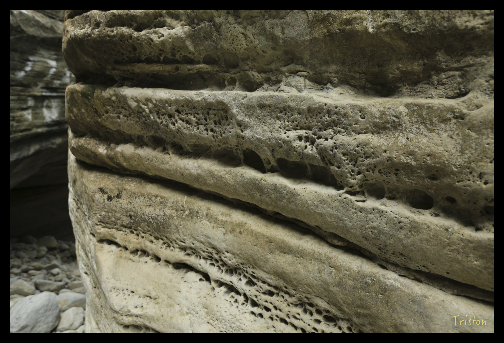 這裡的地質看來是沉積而成的片狀粉砂頁岩,在不同年代的水位沉積下,一次次的沉積壓密,再加上地形的推昇,形成如此的水平層理;兩邊的層理線應該兩兩相對相連,所以峽谷兩邊的沉積年份應該相當,然後中間再由水流侵蝕切割而成