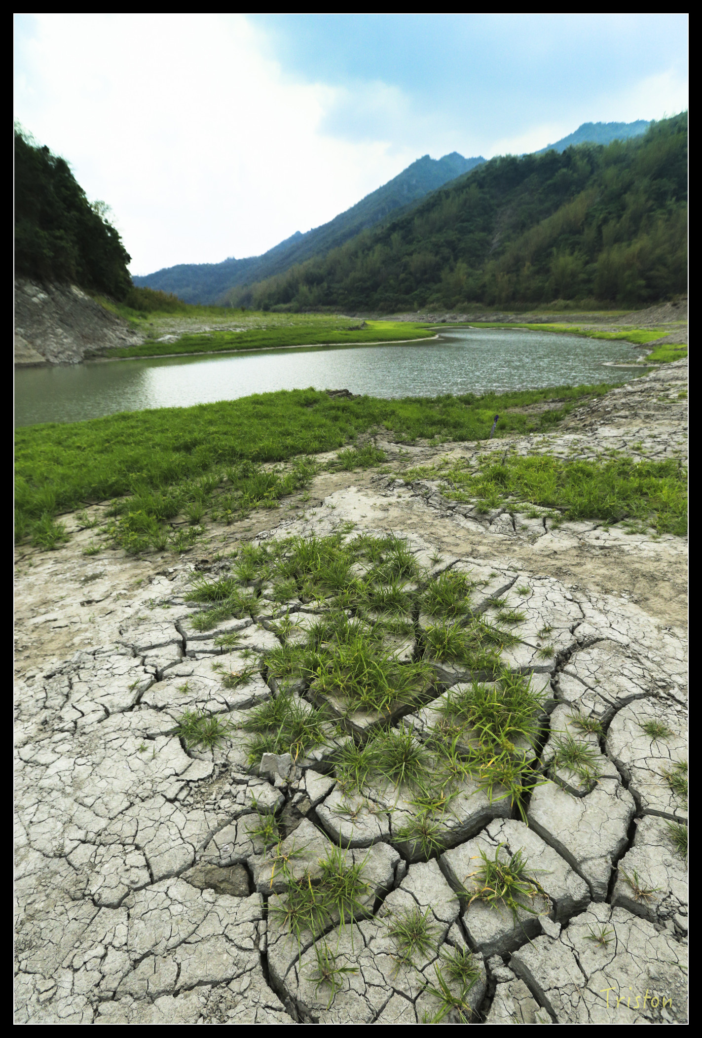 過了獨木橋,大約還得走500米才會到谷口,不時可以看到乾裂的泥地和因為有水滋養生生不息的綠草皮