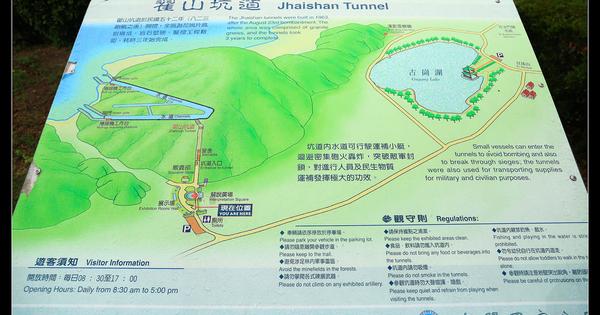 出口處有張成功坑道位置解說圖,坑道全長六百二十公尺房,沿著海岸線鑿建,形成有效的海防掩體工事,可以在敵人登陸時有效的射殺敵軍