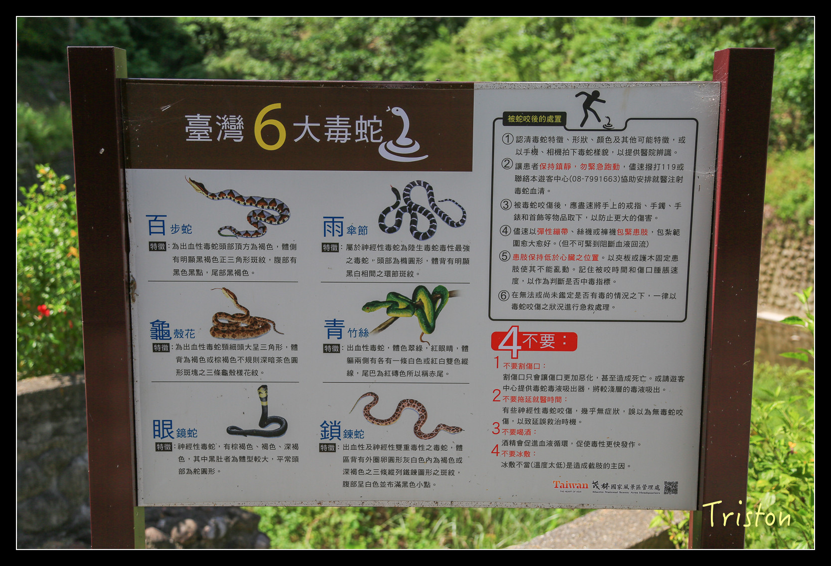 一看6大毒蛇,兒子眼睛都亮了,細細地看了一遍,後來才知道原來他是待會兒走棧道時要考較我來的。