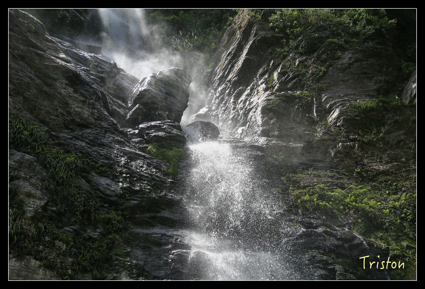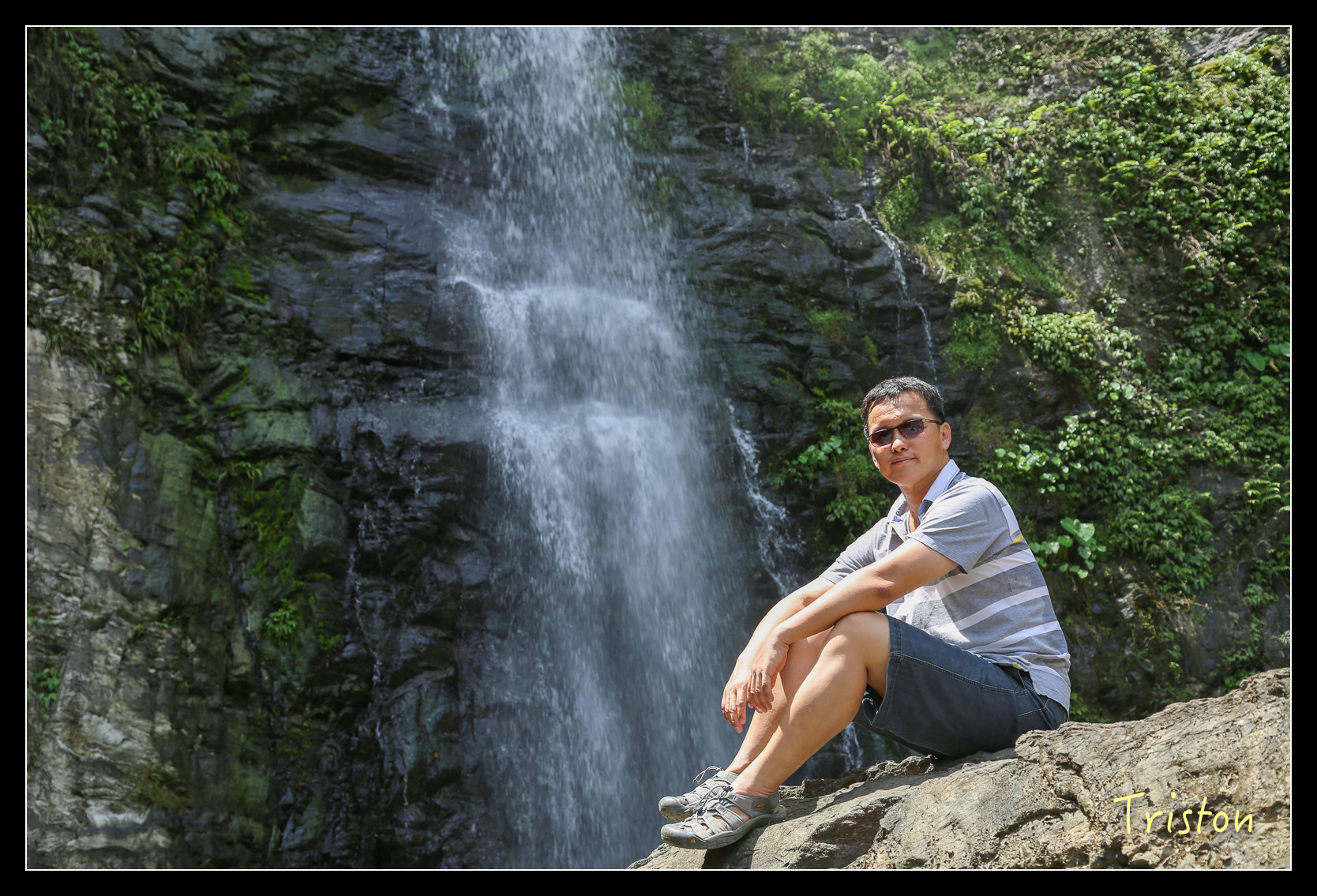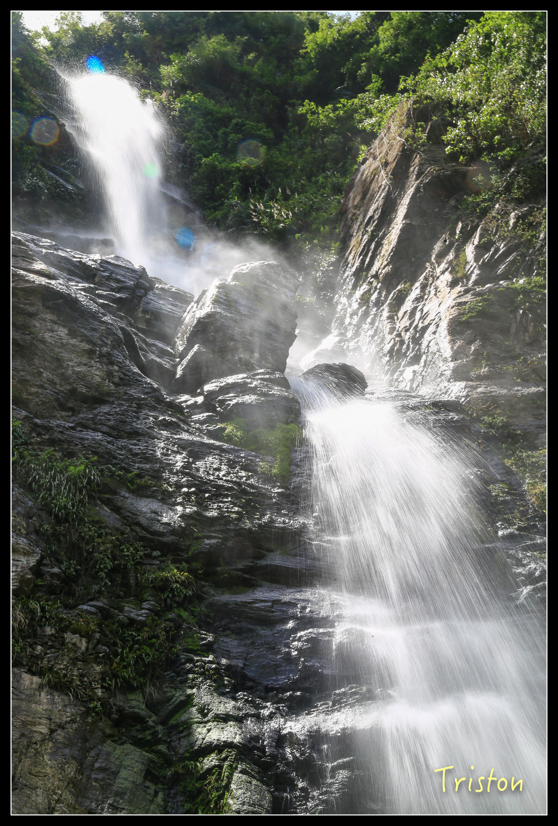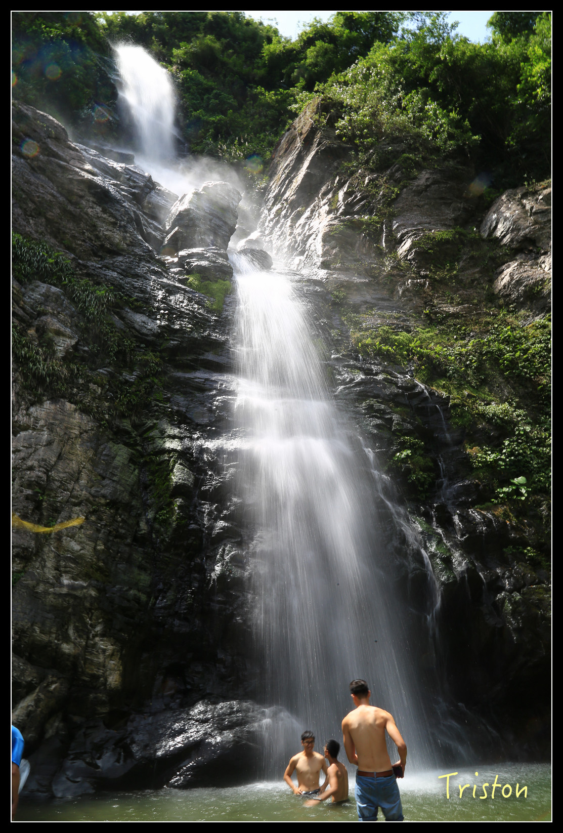 就在眼前了,高約五十米,雖然中午時分,但躲在陰涼處,瀑布下沖濺起的水花讓人挺涼快舒服