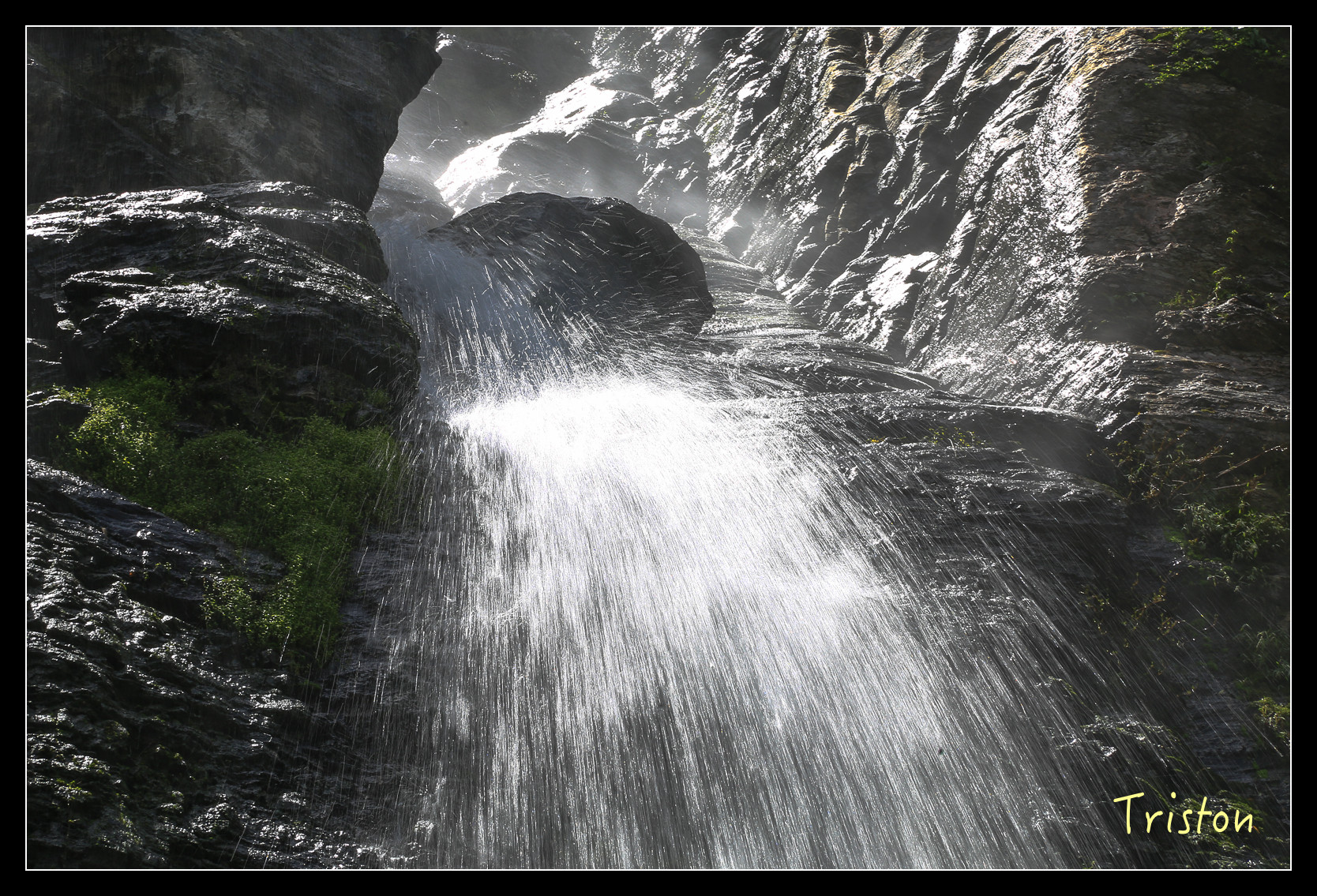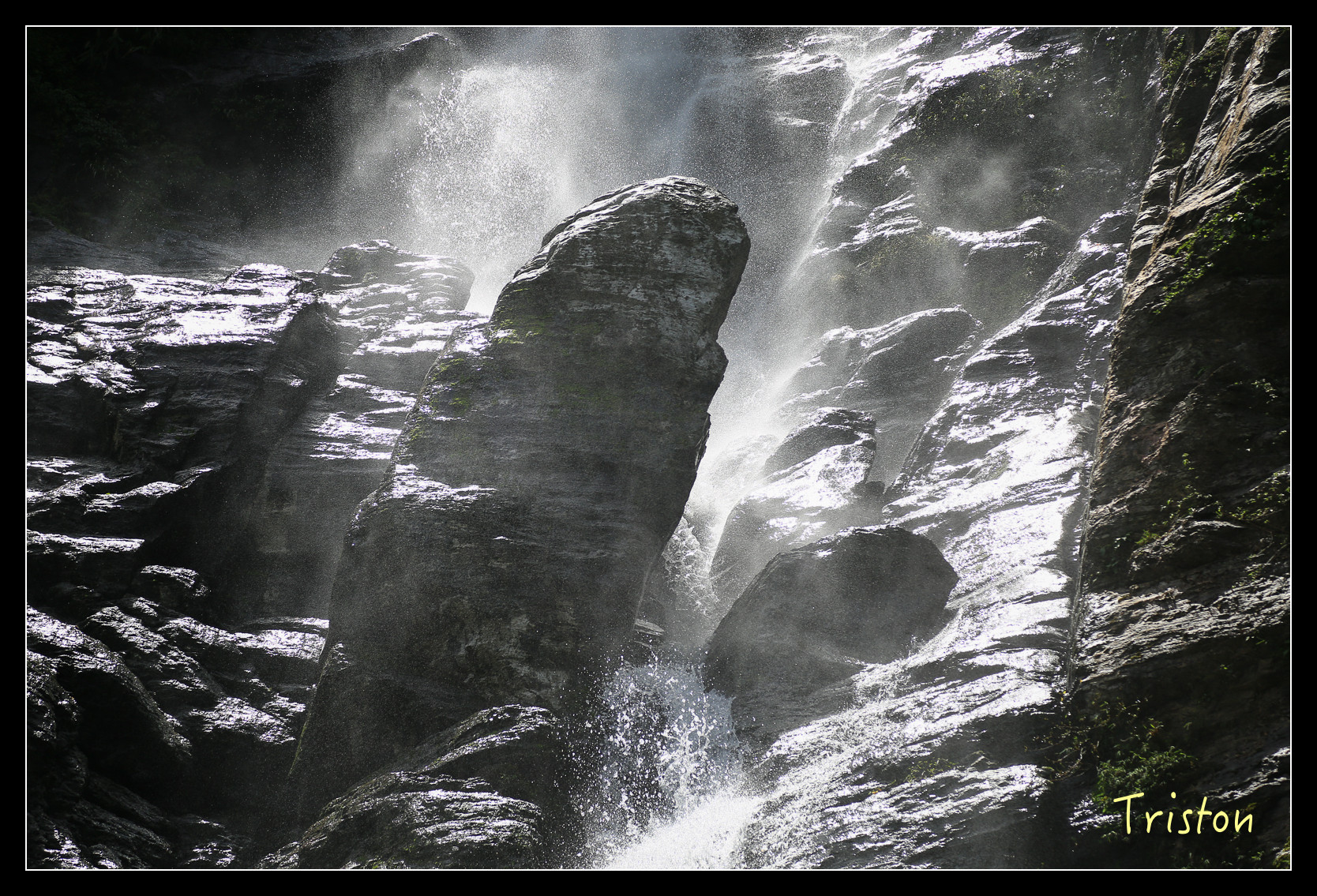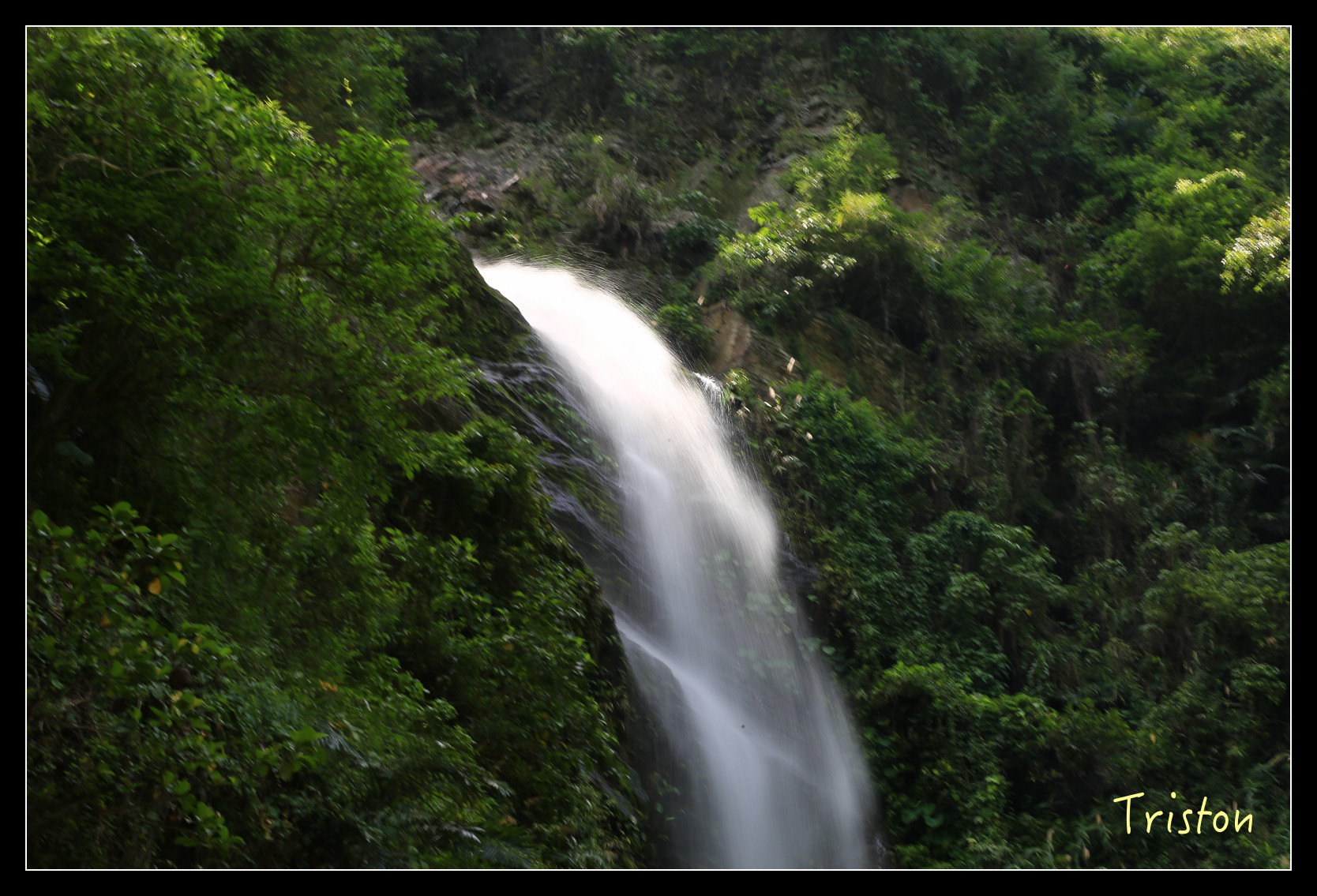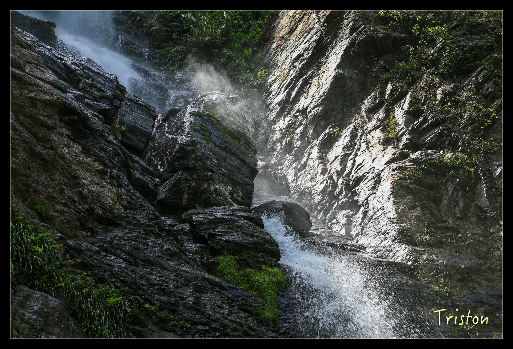 就在眼前了,高約五十米,雖然中午時分,但躲在陰涼處,瀑布下沖濺起的水花讓人挺涼快舒服