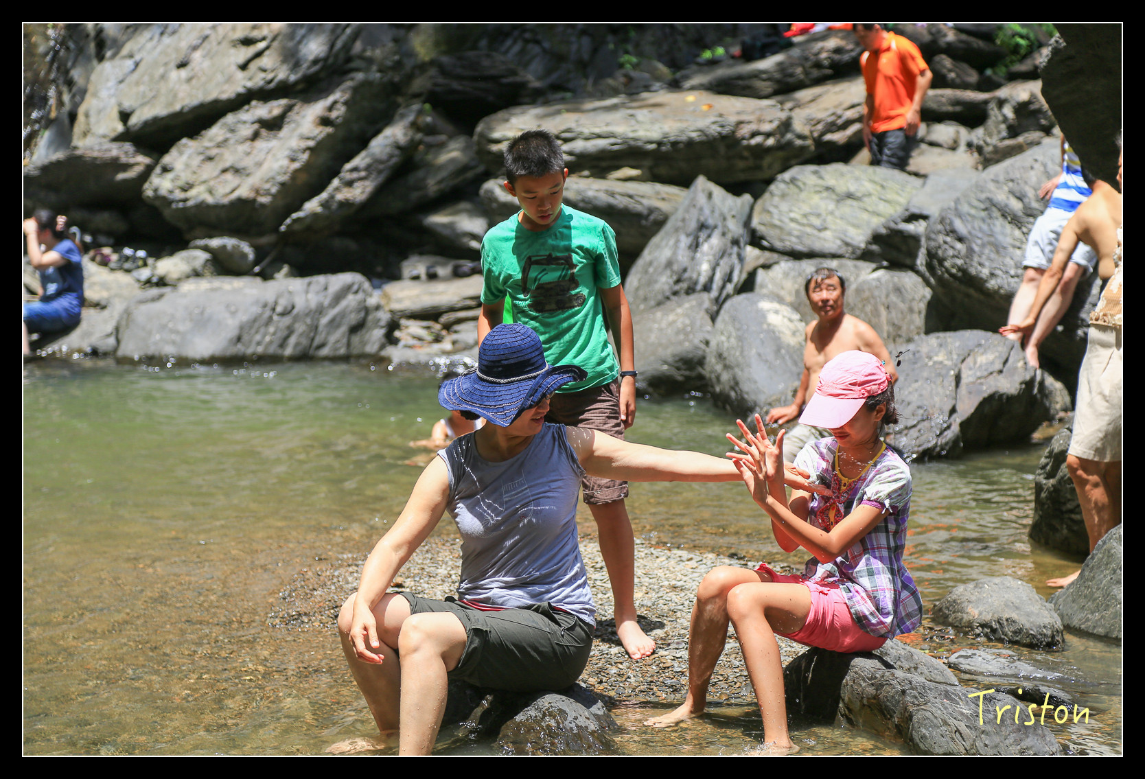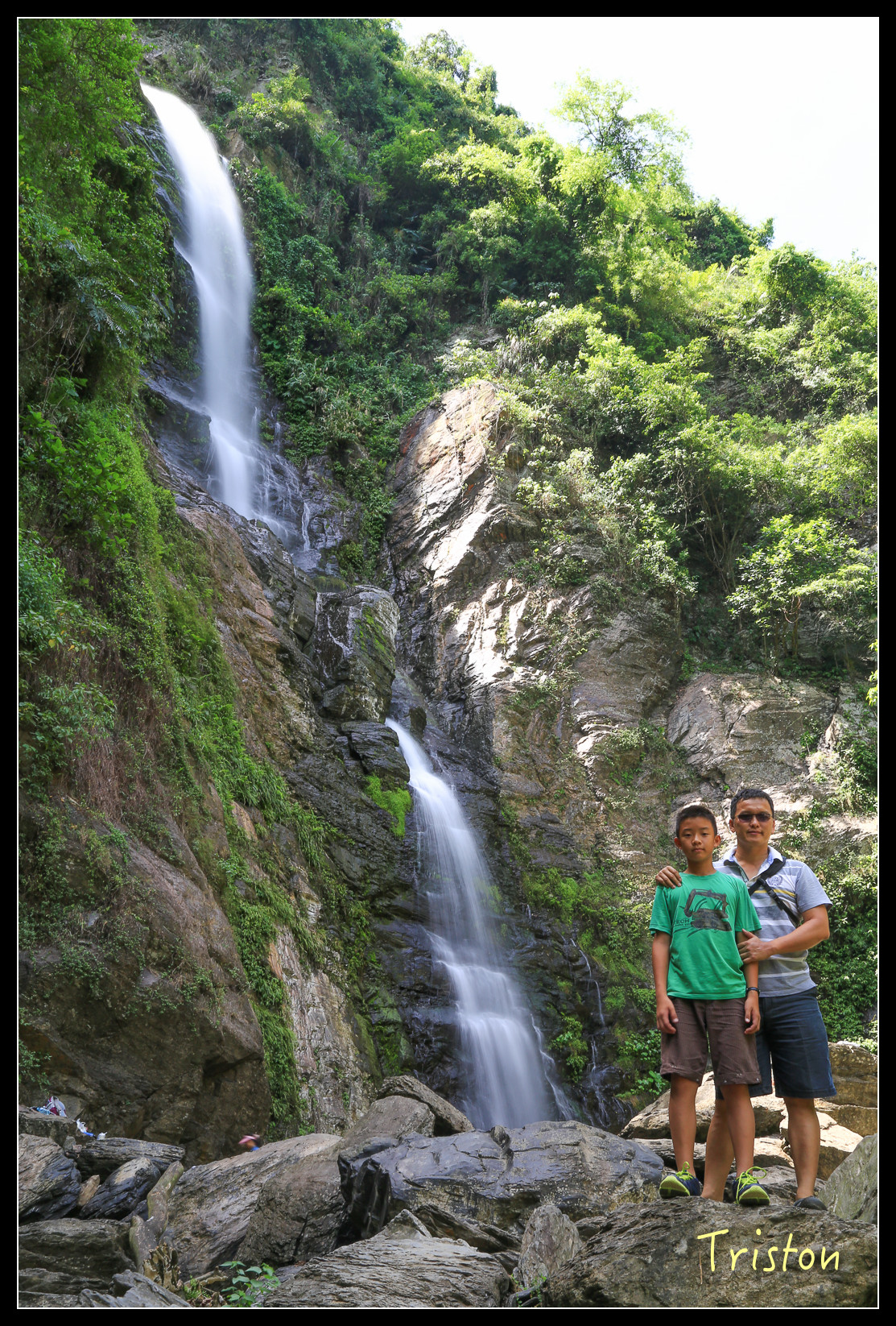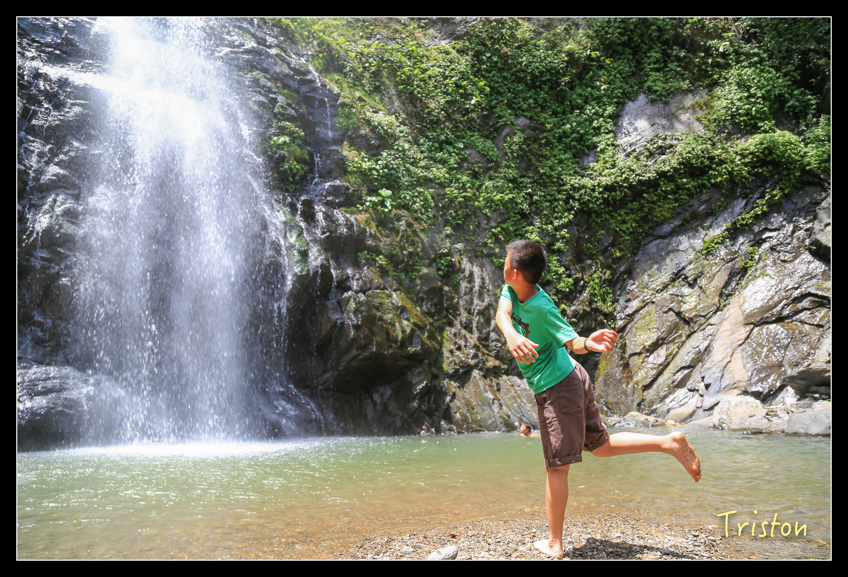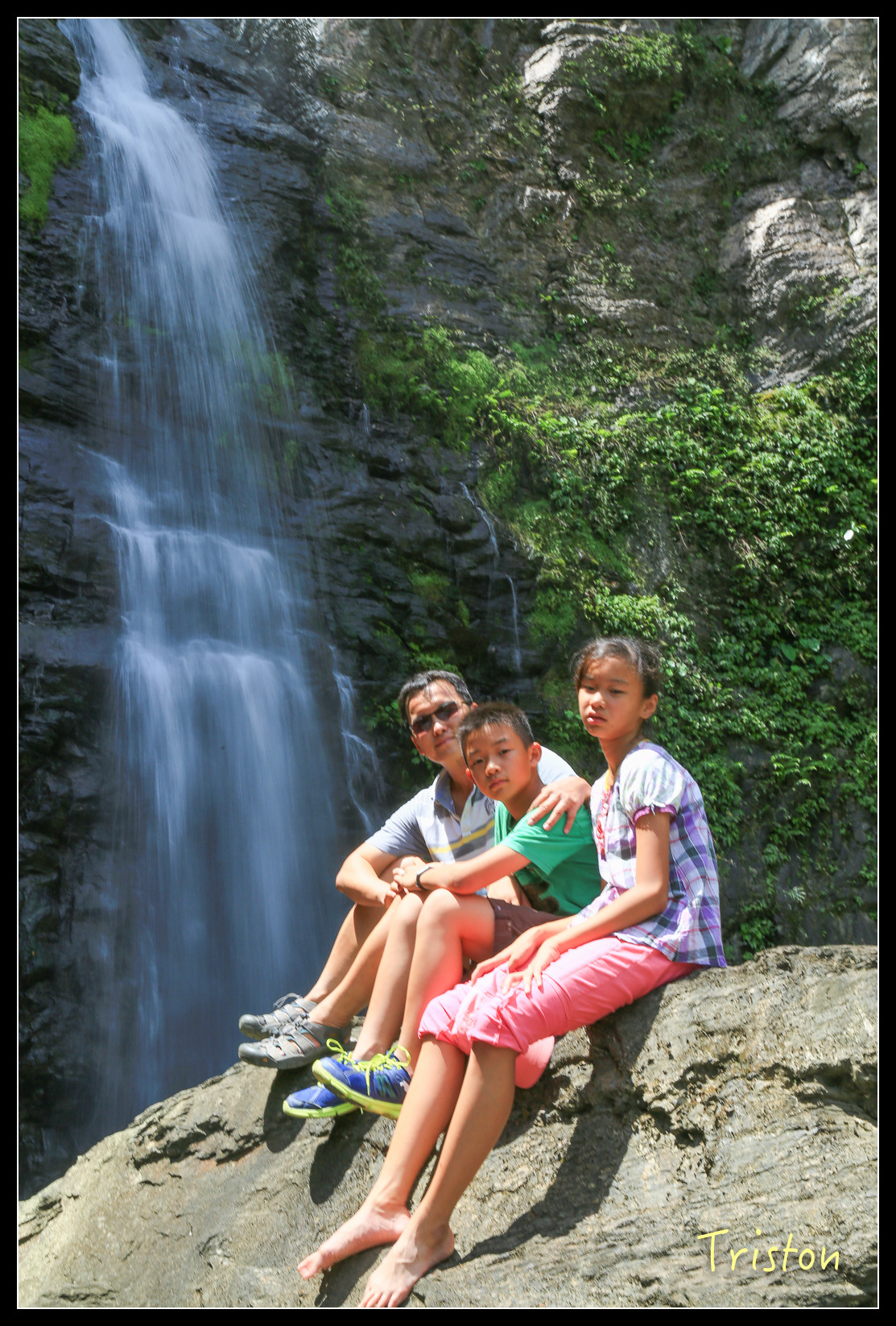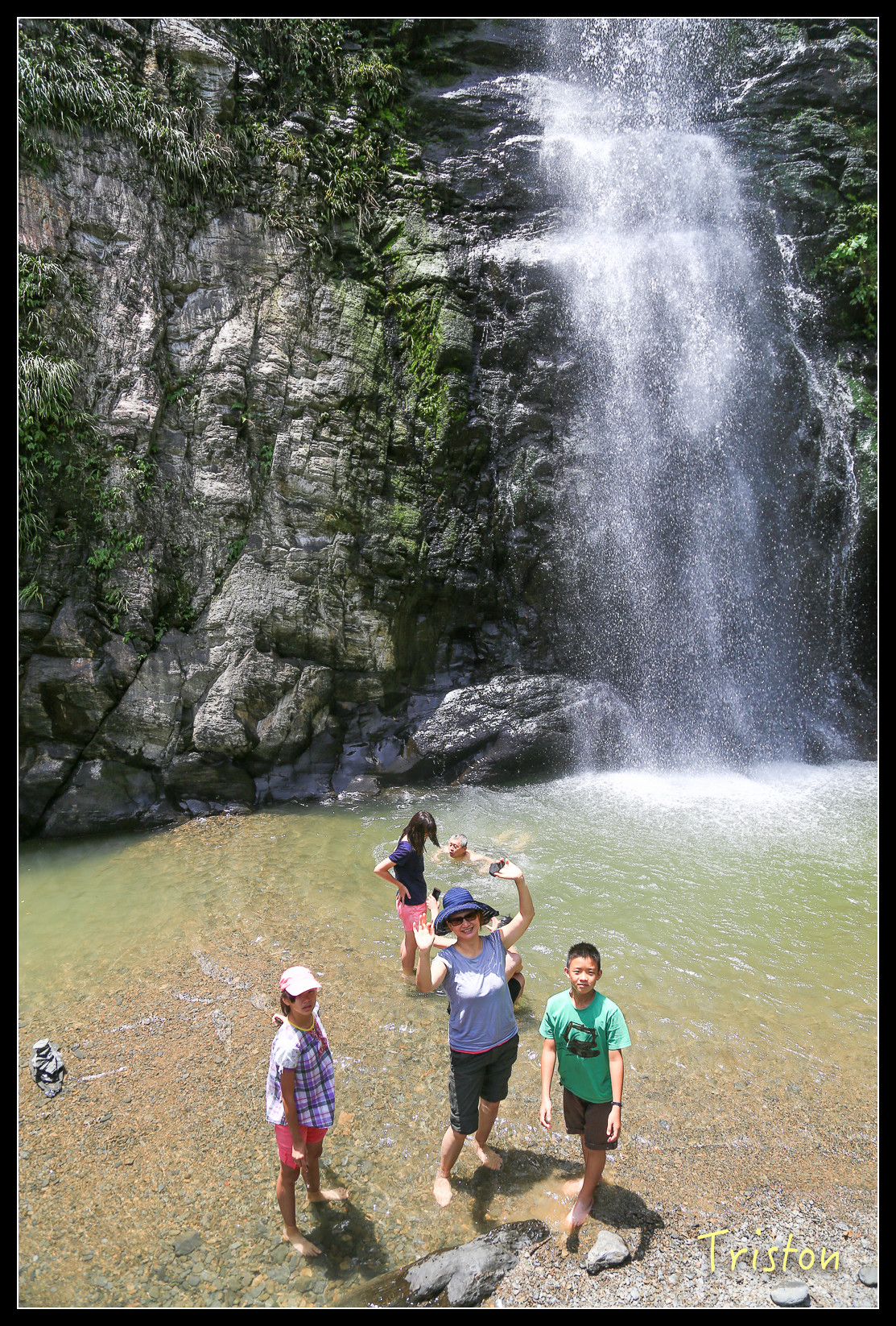 瀑布底下有一水池,來了不少家庭和大學生,在潭裡嬉戲!我們只在水邊泡泡腳,有時反省,會不會我們太過矜持,少了點熱情和衝動,這樣對小朋友到底是好還是不好,人家說"人不痴狂枉少年",我是枉少年了,但總不能讓小朋友也枉少年吧!?
