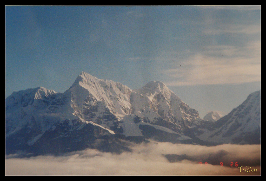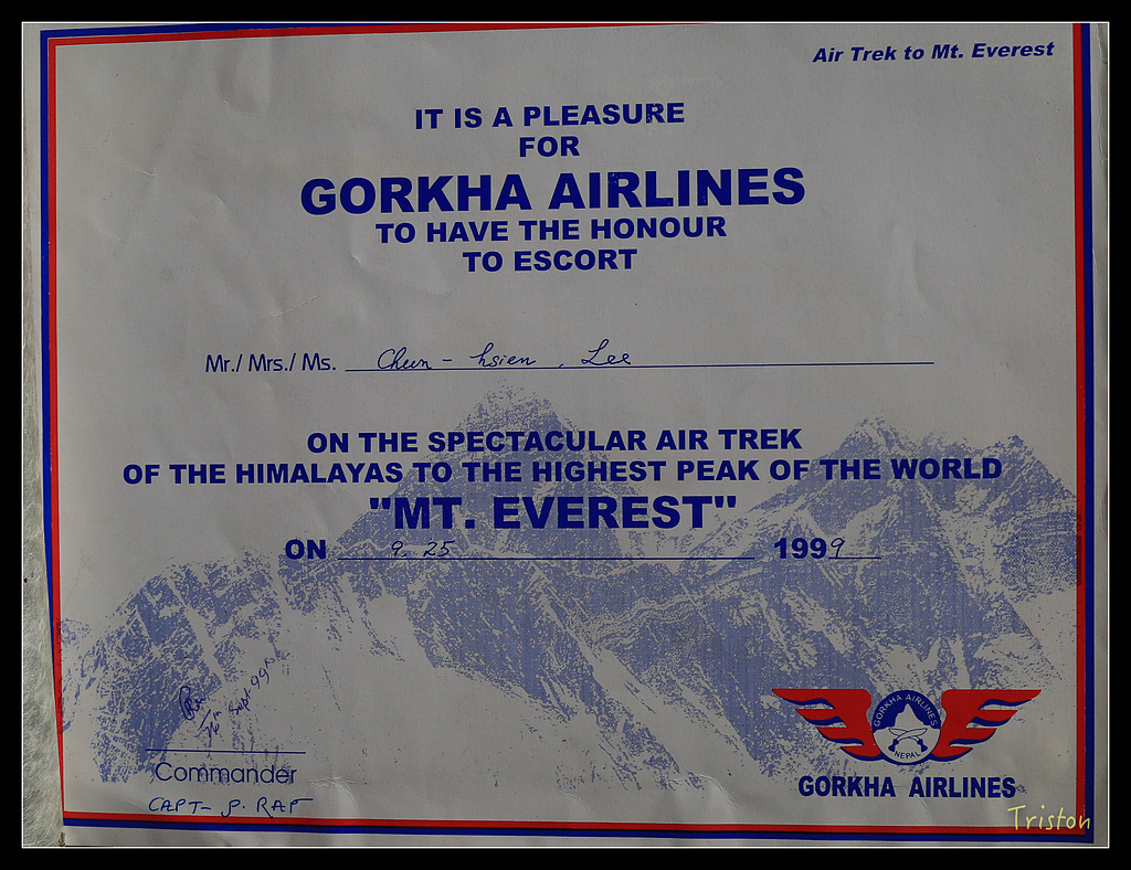 19990926 今天的行程很早,我們要搭小飛機去聖母峰(珠穆朗瑪峰),其實我們心裡有點害怕,因為我們搭的是GORKHA Airlines的Do 228小飛機,那一陣子在馬祖機場常摔機,就算在尼泊爾,我記得升空前四個月才摔了一架,如果沒錯的話,回國後半年又摔了一架,可見我們是冒著多大的危險去做這件事