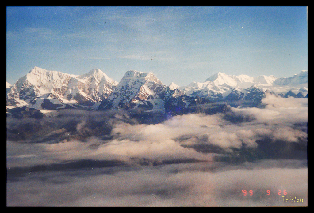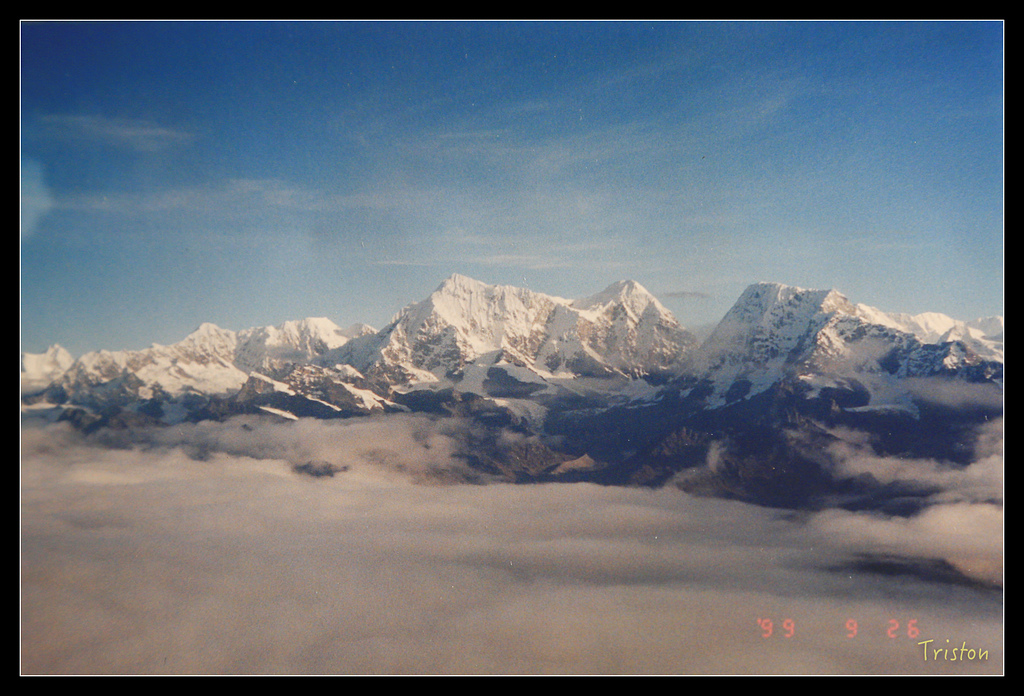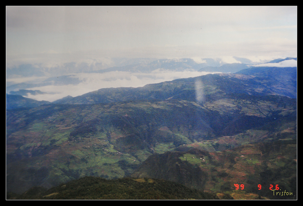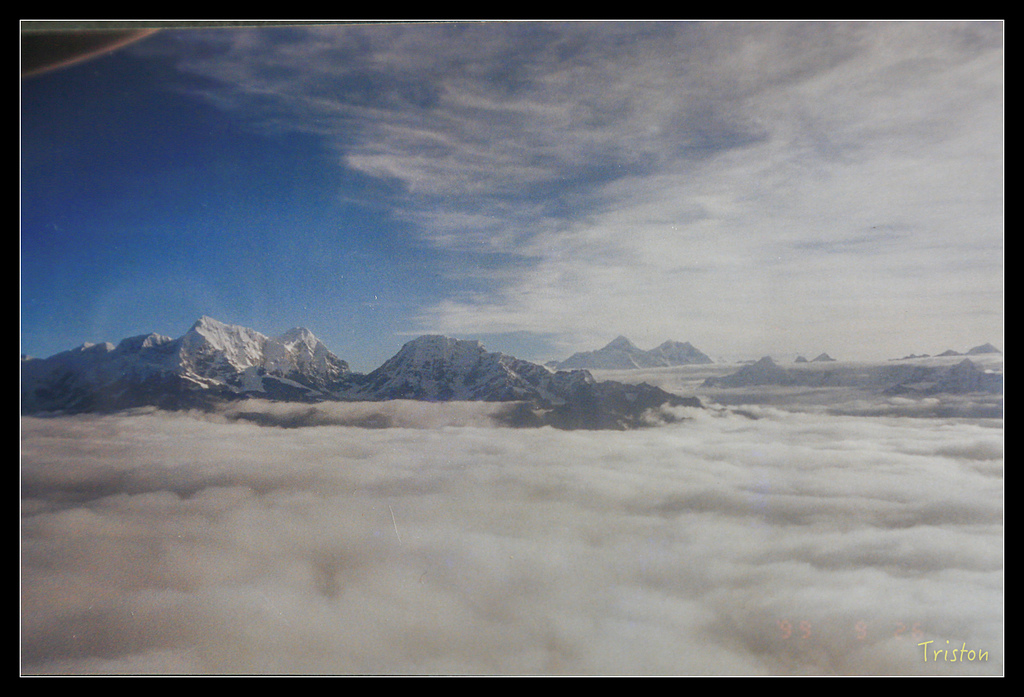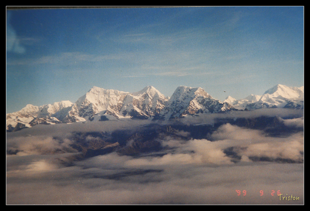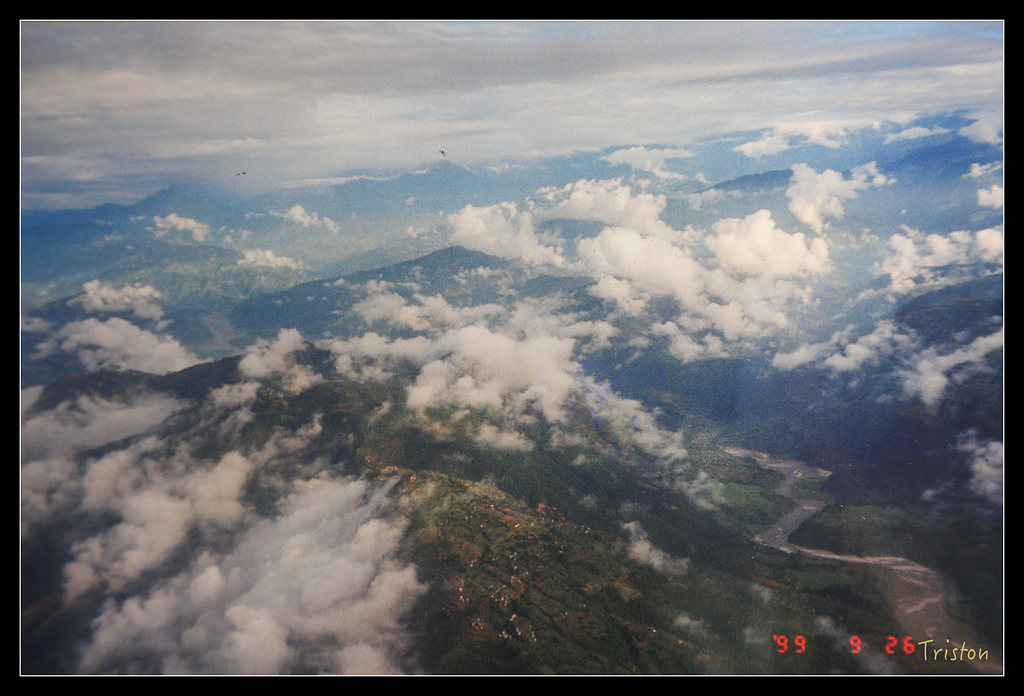 印象很深刻,飛機不斷的爬升,穿過一層雲後,看到第一重山,直覺就是好高,拿著手上的山形圖比對,然後問空服員,Mt. Everest????空服員連座位也沒起來,比比手指,No No.還早的很
