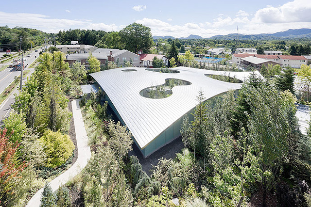 千住博美術館的造形特殊,在曲面屋頂的館內,巧妙地切出1數個圓形的玻璃中庭花園,在不規則的弧形切面中,又形成了另一綠意的視野及獨立的觀賞空間。著。稍後,我在館內紀念品店中看到美術館眺望圖,完整看出原來空間融合在一個波浪曲面的大屋頂下,4座透明玻璃的小花園則像往蒼穹的任意門,不小心就讓人神遊在另一個淨土之中。