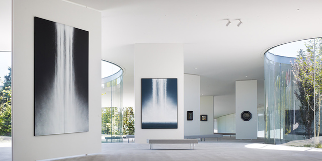 就算不喜歡千住博的作品,在極簡卻又寬廣的空間裡,不分裡外地,也可以感受到極沉靜的氣氛!也許也是西沢立衛的設計,才得以和千住博的作品相互輝映吧!