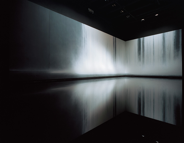 靜室裡,一大面的畫作倒映在一平無波的水面上,我幾乎以為那是一面可以踏上去的鏡子或是反射的地板,沒有任何的解說,只需要坐在觀賞的長椅上,沉默的聲音早已傳送到心裡,可以感受到這股和天地人化為一體的悸動。