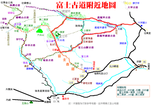 我很好奇到底我們繞了多少路呢?怎麼和原先預想的感覺完全不同,上網查了富士古道附近地圖,發現我們今日路線如下,由大坪國小左上三叉路口進入鹿堀坪古道,然後下切進鹿堀坪瀑布,回到古道後又上行至鹿堀坪山,回到古道後一路經過梯狀草原,跨過頭前溪,進入第一草原,然後就橫過第一草原進入富士古道,到達石棚土地公,過了石棚土地公後又右轉回到富士山腰古道,經過石板殘基,回到鹿堀坪越嶺古道,然後出現在石橋,回到入口處,原本以為走了很遠,沒想到才這麼小小一圈,大隊人馬就走了五個多小時...