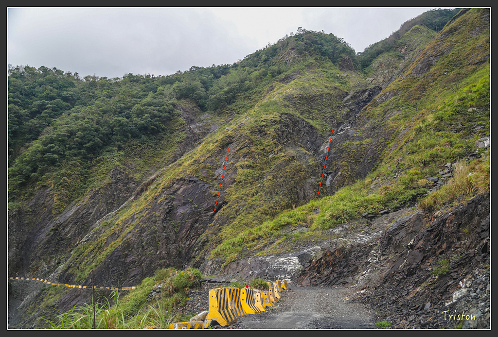 抵達阿禮部落門口前,除了吉露崩壁,還有一段更為壯麗的阿禮崩壁橫亙在前,崩塌面岩層出露情形,右側瀑布為不同岩性的交界,左側裂縫為斷層䤏。