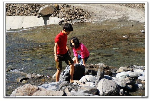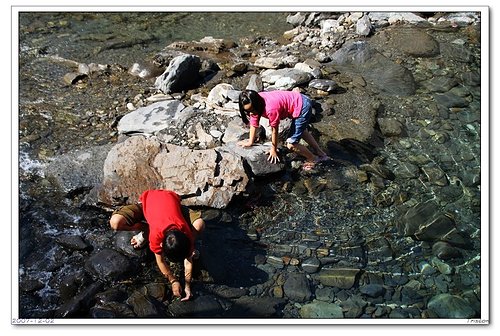 山谷中的河水,竟然比空氣還暖..小孩子就忍不住啦..