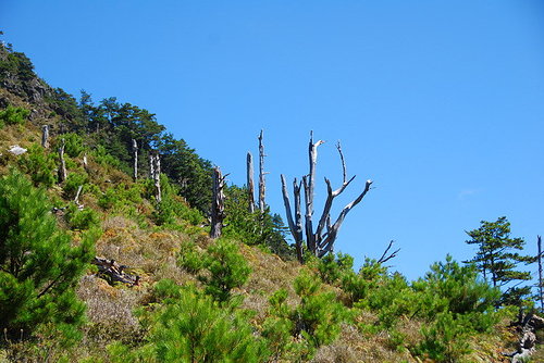 玉山東峰像偷窺者一樣,在山坡的那一頭突然冒出頭來,像是嘲笑我們這一批氣喘噓噓的登山客,那令人望之儼然的裸坡卻又挑釁似的說:想上我,再等等吧.