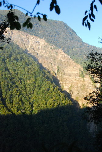對面山頭是玉山山脈的對關山...谷底的陳有蘭溪不斷的侵蝕河谷..陡峭的山壁上..