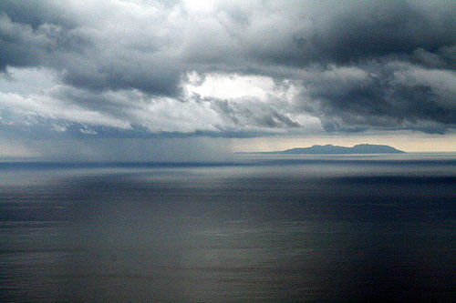 遠方的綠島,烏雲密布的海面上正下著大雨,雲正緩緩的飄過來