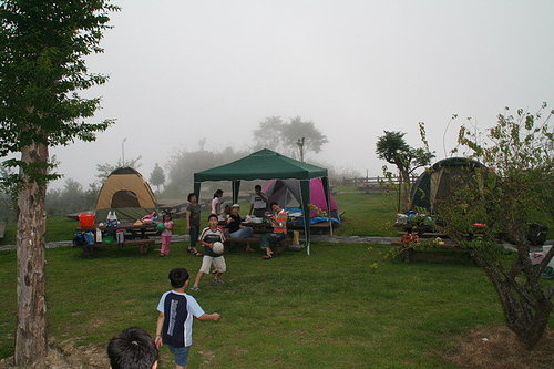 經過金針山的一路蜿蜒,藉著GPS及沿路民眾的協助,我們一行人終於抵達了金山啞口野營區,雖然只有一條路上山,但由於路上的指標不明顯,小禎禎一家硬是開到對面的雙乳峰上,如果不是手機尚通的話,恐怕就有人要乳頭上過夜了..