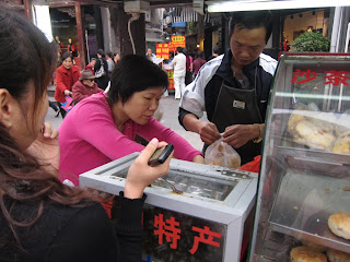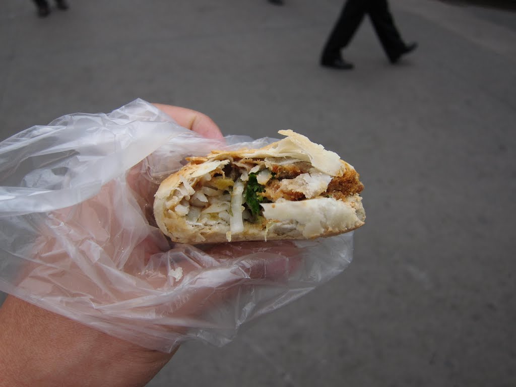 突然看到有一家店,有一個小姐長的挺不錯的.其實我們是被她的背影吸引過去的.不過來不及拍到咧....她是在買一家號稱"廈門漢堡"的夾餅,看起來還不錯,我們向來鼓勵嘗試新鮮東西的,當然就義不容辭了.