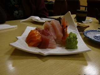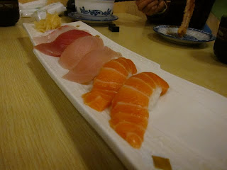 | 第一道生魚片,超大片.入口的感覺鮮嫩且綿綿的,當然更沒有退冰過柴柴的味道和冰屑了 |