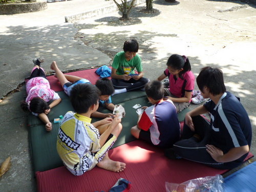 年輕就是不一樣啦...剛剛還在那兒喊累,這會兒己經玩起撲克牌了.真是活力滿滿