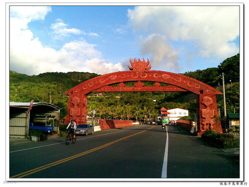 過了分水嶺,一路下行,真是說不出的暢快啊,沒幾分鐘,就來到了牡丹市區,過了牡丹水庫下大橋,這裡應該是魯凱族的聚居地吧!別具特色的橋墩上刻了原住民的百步蛇圖騰來做為外觀風貌,超顯眼的紅色大橋,引來不少人在此稍做停留並,拍照紀念。