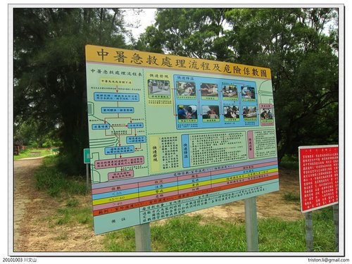 附近也可以看到部隊的訓練場,最明顯的告示竟然是"中暑急救處理流程"